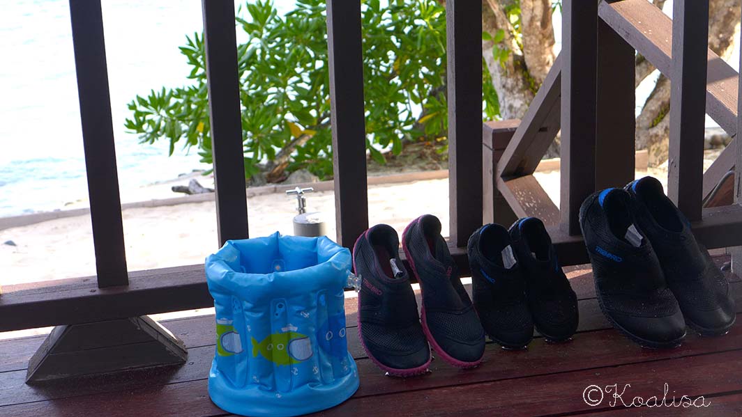 Pour les vêtements, il faut vraiment prévoir le minimum : des shorts et des t-shirts, un maillot, un pantalon et un pull à cause de la climatisation ( aux tours Petronas notamment, et dans le métro aussi !) ou si l’on va dans les montagnes, et une ou deux paires de chaussettes. Pas besoin de pyjama, un t-shirt suffit. Pour marcher, des sandales et une paire de baskets (en cas de marche dans la jungle mais on n’en a fait qu’une toute petite, Canaillou est encore trop jeune). Si l’on va dans les îles, attention, il faut penser aux water shoes, les coraux peuvent faire très mal.