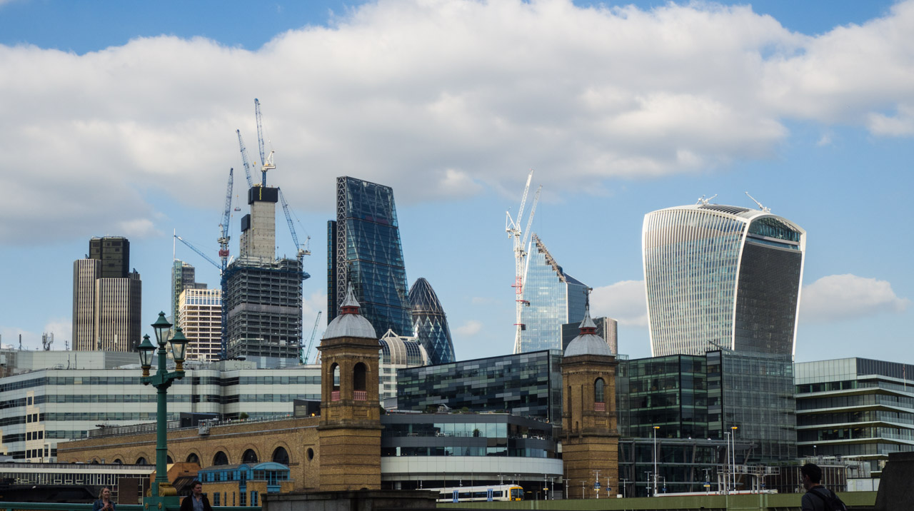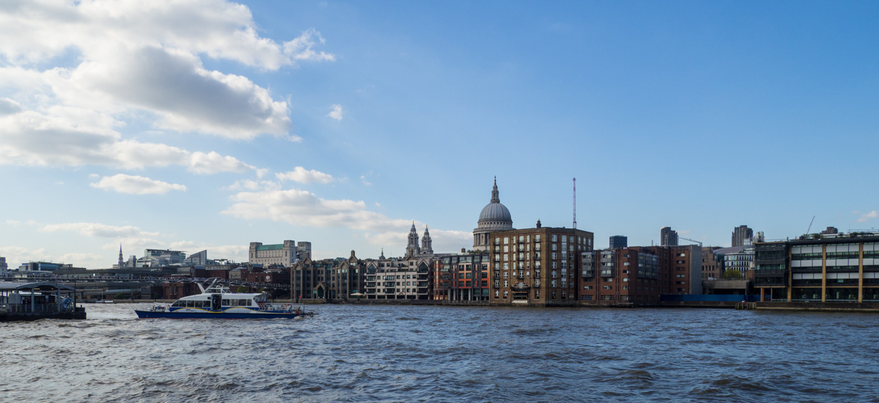 Quand nous sommes sortis nous avons longé la Tamise un petit moment. La vue sur Londres est très belle, avec la cathédrale St-Paul de l’autre côté de la Tamise ainsi que des gratte-ciels tels que The Cheese Grater (la Râpe à Fromage) (au milieu sur les deux photos ci-dessous) et le Walkie Talkie (à droite).