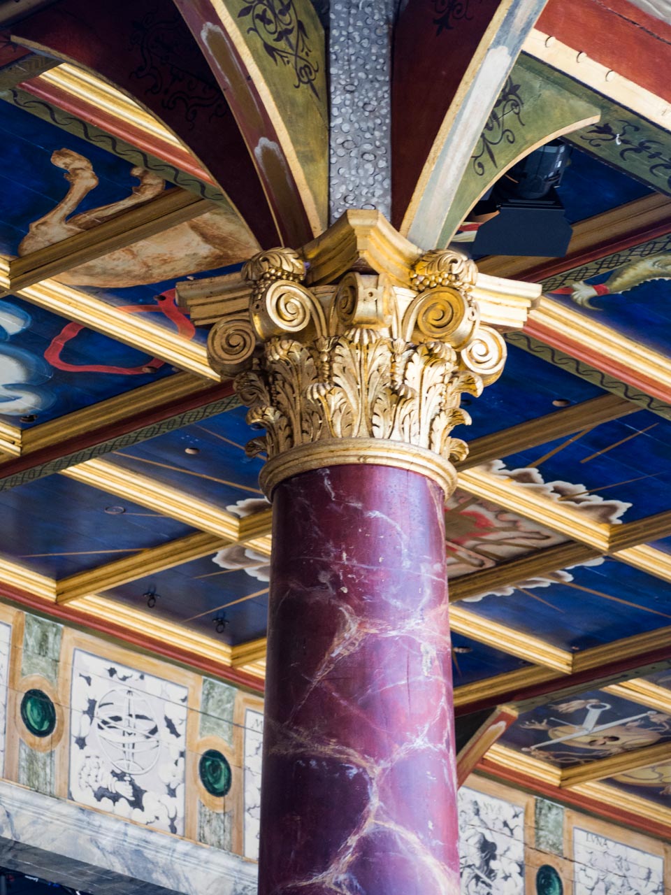 L’espace où les acteurs jouent est une scène comportant des piliers en bois peints avec un effet marbré.