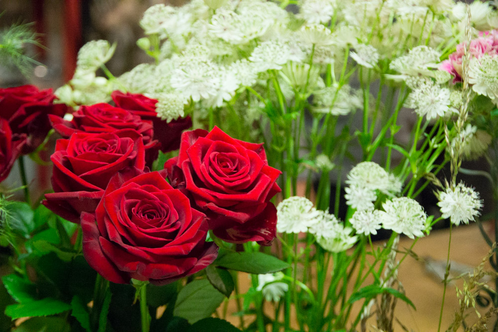 Quand on fait son bouquet, il faut arranger les fleurs en tenant les tiges d’une main, ajouter les fleurs et ne pas oublier de tourner le bouquet régulièrement pour qu’il soit bien équilibré. Cette phase n’est pas forcément facile…