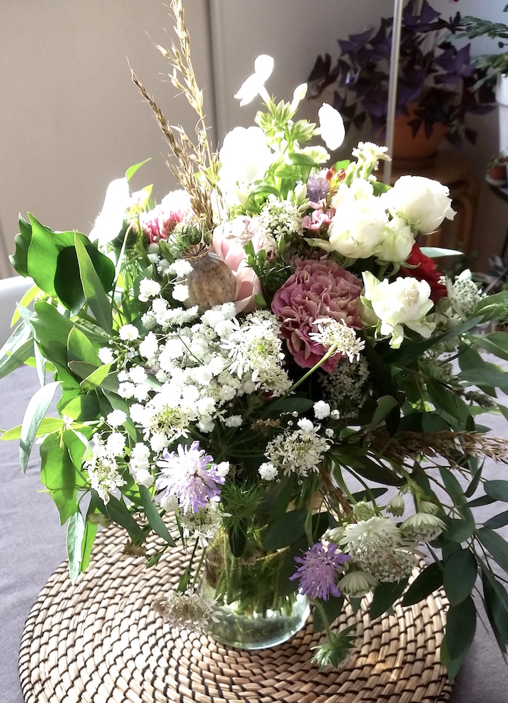 Nous prenons place de part et d’autre de la grande table et commençons par choisir les fleurs et feuillages qui nous plaisent : roses, oeillets, nigelles, feuillage d’ eucalyptus, de cassis, de lierre et même de glycine ! Je n’ai pas retenu tous les noms mais il y avait beaucoup de variété.