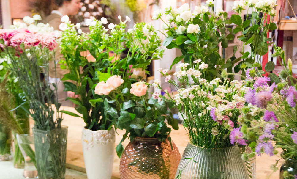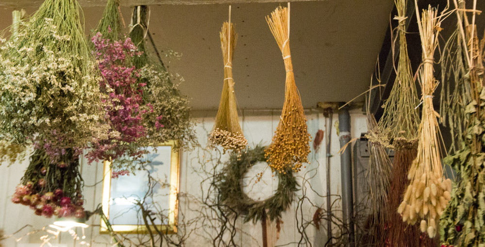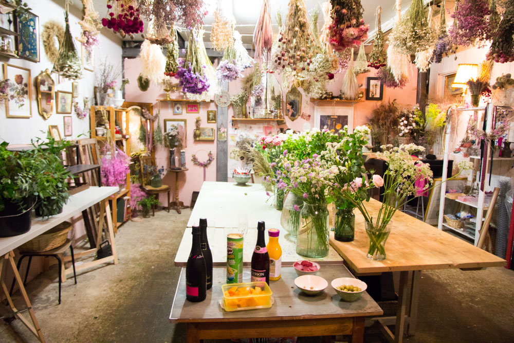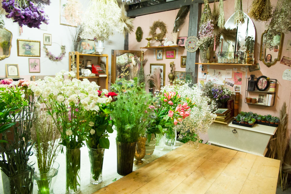 Ne cherchez pas de vitrine de fleuriste, Camille reçoit dans son atelier, une véritable caverne d’Ali Baba fleurie. Son univers est fait de flacons anciens, d’objets vintage, de rubans, de fleurs fraîches ou de bouquets en train de sécher la tête en bas. On est dans un autre monde !
