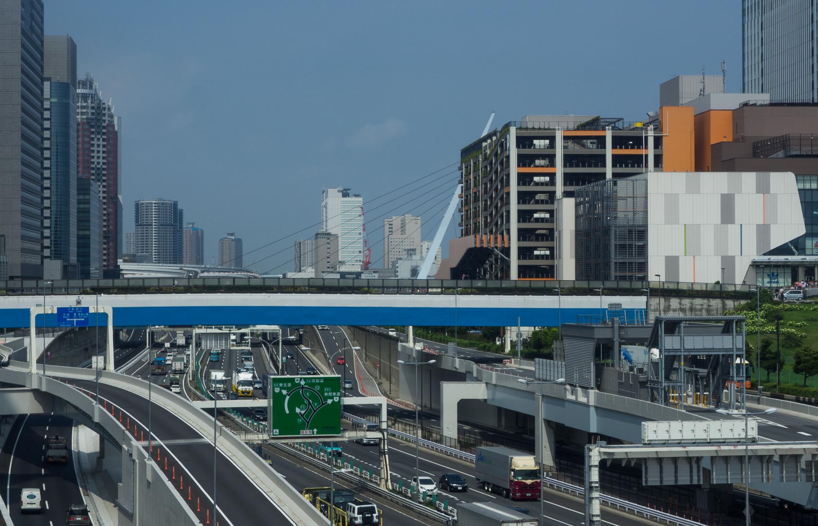 On peut voir le Tokyo Gate Bridge, un pont à poutres en porte-à-faux (excusez-moi pour les détails techniques ! ). Sa forme un peu spéciale lui vaut le surnom de pont-dinosaure…