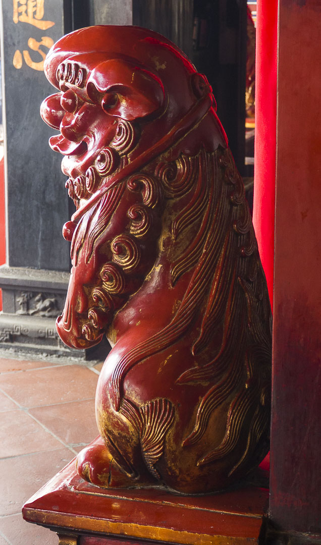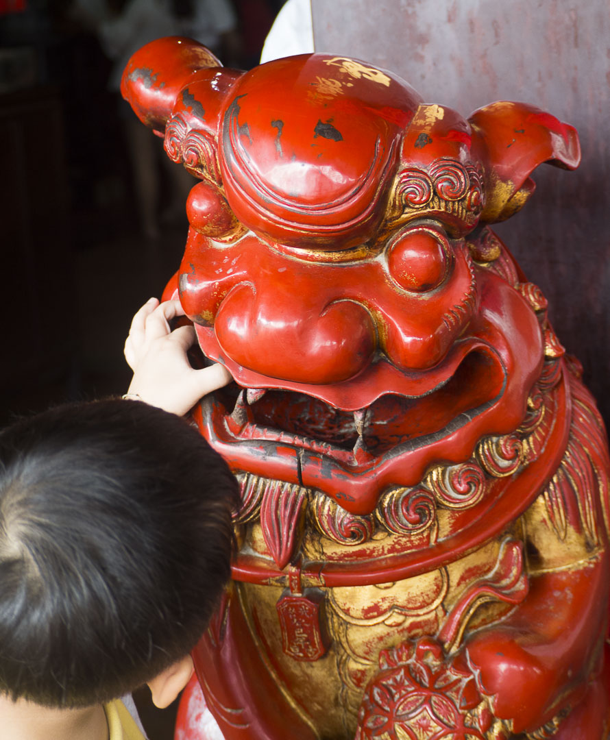 Dans la gueule de cette statue de lion gardant le temple se trouve une boule en pierre. On peut mettre la main dans la gueule du lion et faire rouler la boule, ça porte chance…Les enfants adorent !
