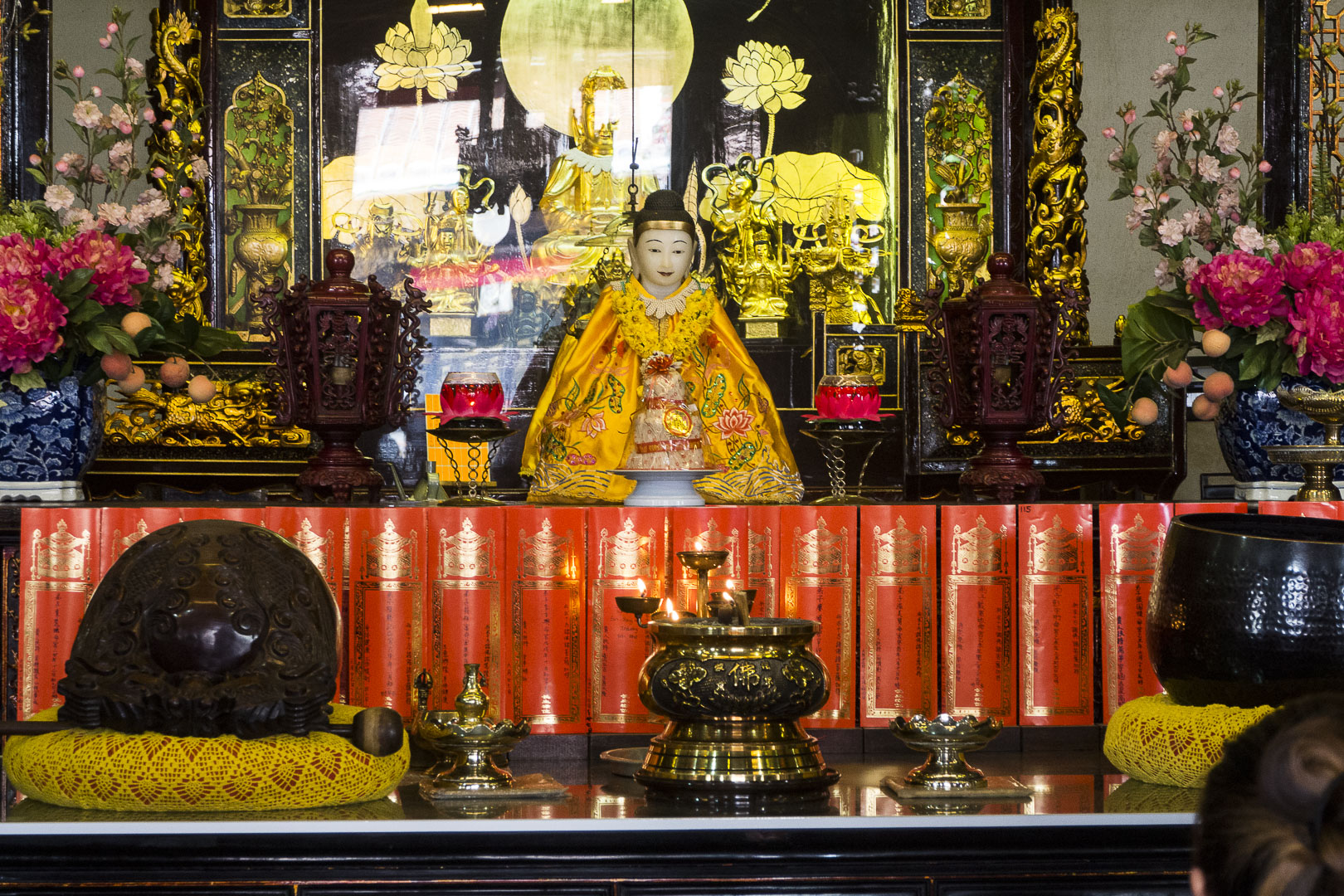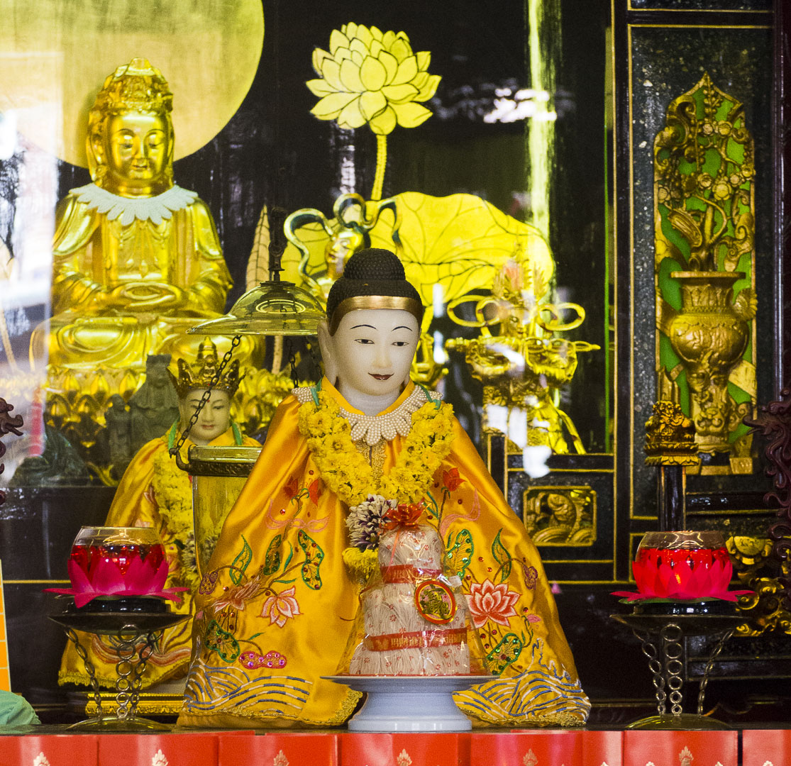 Le hall principal est dédié à la divinité de la miséricorde Guan Yin (ou Kuan Yin), mais on y trouve aussi des autels consacrés aux divinités bouddhistes de la longévité et de la richesse.