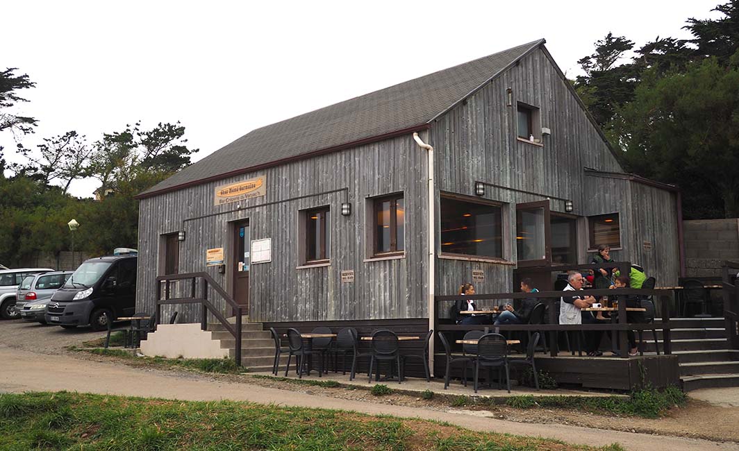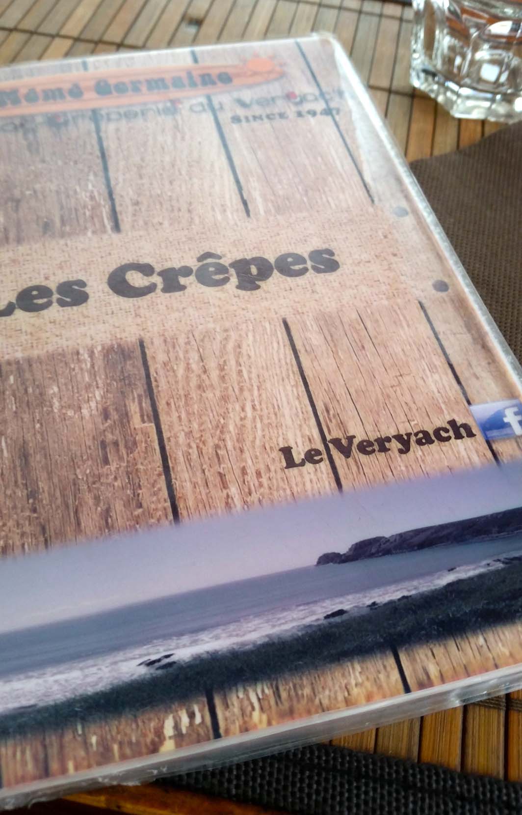 La crêperie du Veryac’h , ou Chez Mémé Germaine, existe depuis 1947, perchée au-dessus de la magnifique plage du Veryac’h. On peut y manger dehors si la météo le permet, et si l’on n’est pas frileux le soir, la petite laine s’imposant car l’endroit est vraiment à deux pas de la mer. Nous avions réservé , ça valait mieux car cette petite crêperie bien cachée ne désemplit pas en été. Du coup nous étions à l’abri, tout en ayant cette vue magnifique…