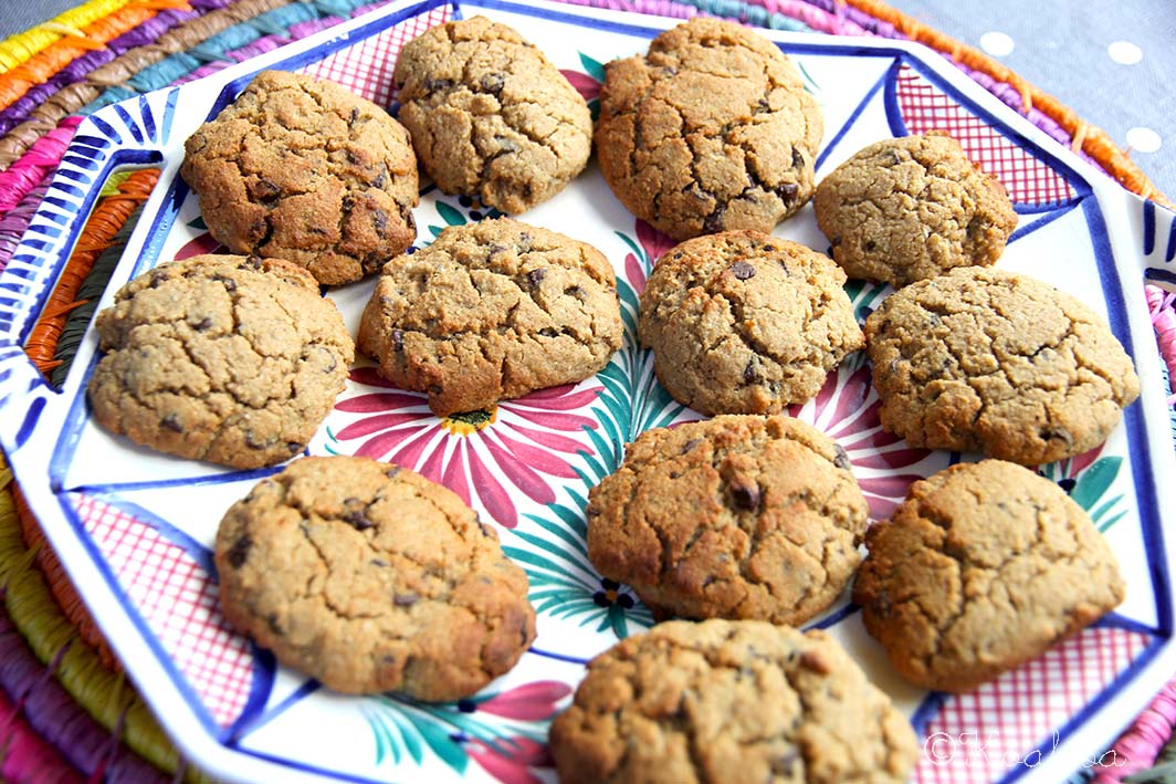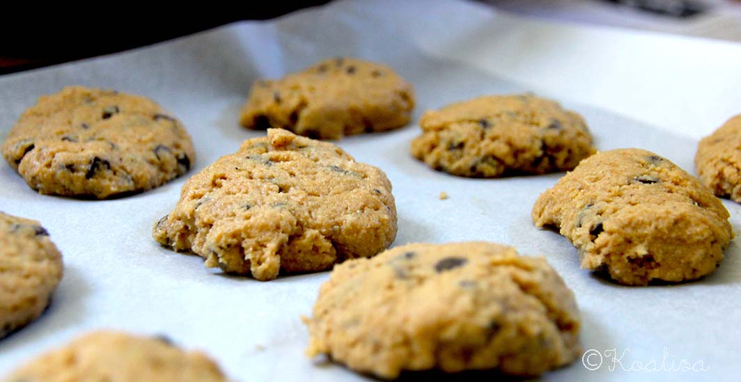 Ajouter au mélange sec , bien mélanger et ajouter le chocolat. Faire de petites boules de pâte et les aplatir pour les placer sur une plaque recouverte de papier sulfurisé.