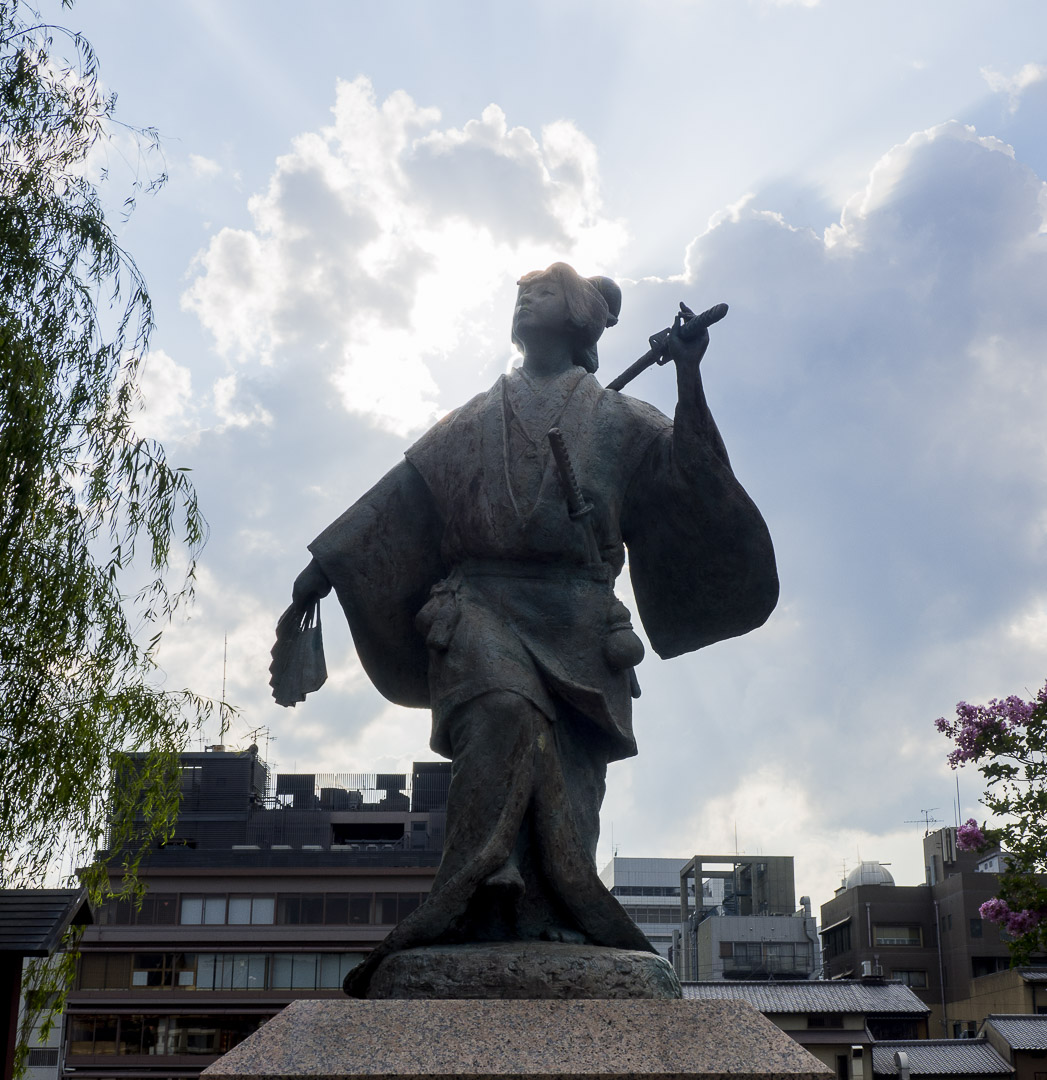 On peut se balader le long de la rivière Kamo où se trouve une statue de Izumo no Okuni, la fondatrice du théâtre kabuki, au tout début du 17ème siècle.. Jouant des rôles masculins ou féminins, elle fut à l’origine d’un nouveau style de danse plutôt érotique. Après sa mort, on interdit aux femmes de participer aux spectacles kabuki, interdiction qui perdurera jusqu’au 20ème siècle !
