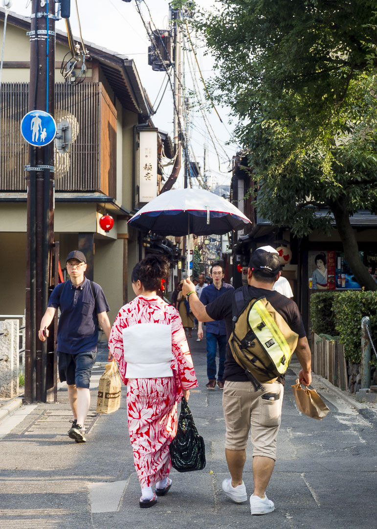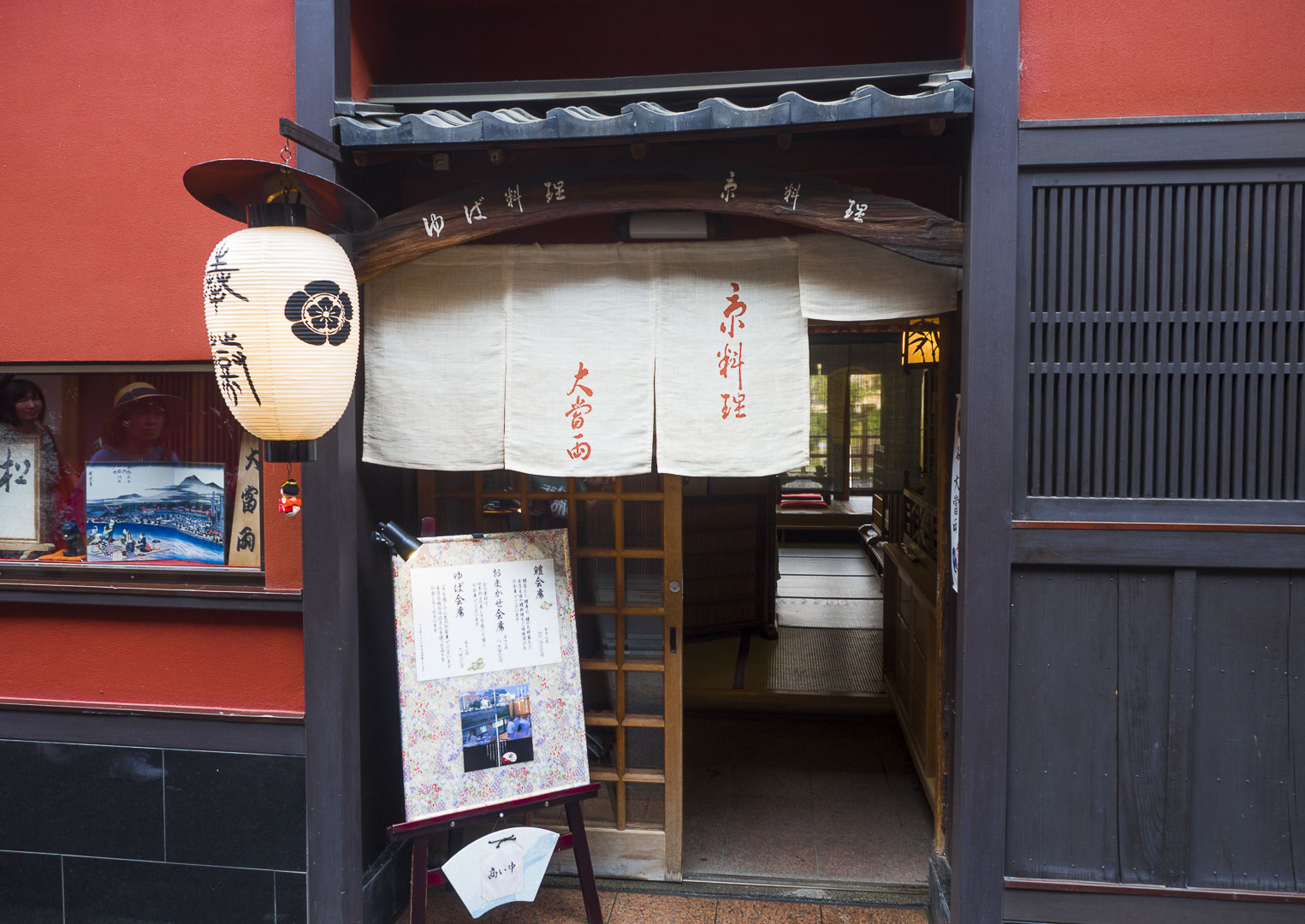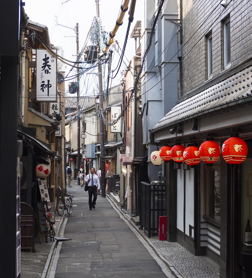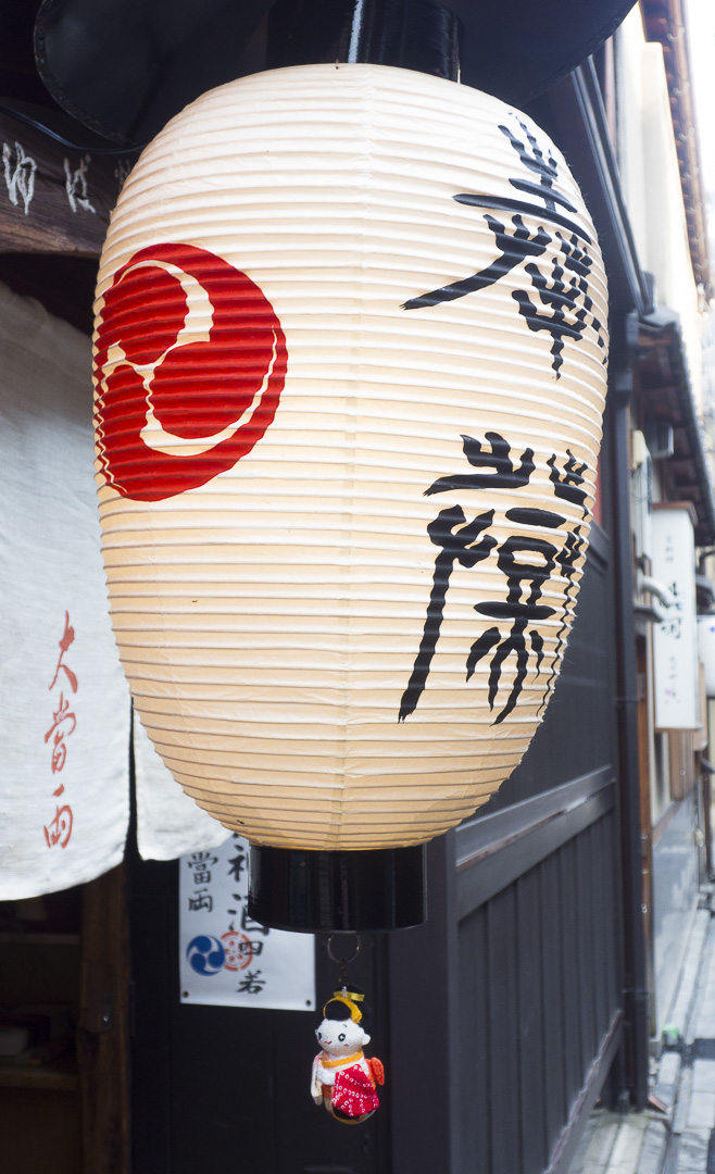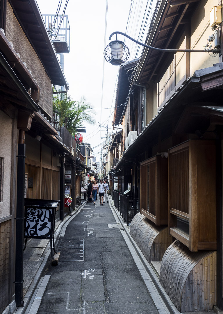 Ici, les ruelles sont étroites, les maisons en bois abritant derrière leurs façades des maisons de thé ou des restaurants protégés des curieux par des stores en bambou ou des noren, ces rideaux japonais fendus.