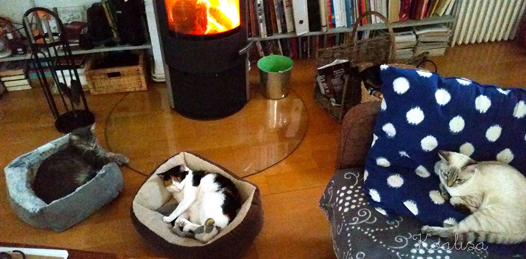 Les chats, c’est bizarre, sont naturellement très hygge aussi… Pas de problème, dès qu’il s’agit de se vautrer devant le poêle, les minettes sont là. Je les appelle Le club de la sieste !