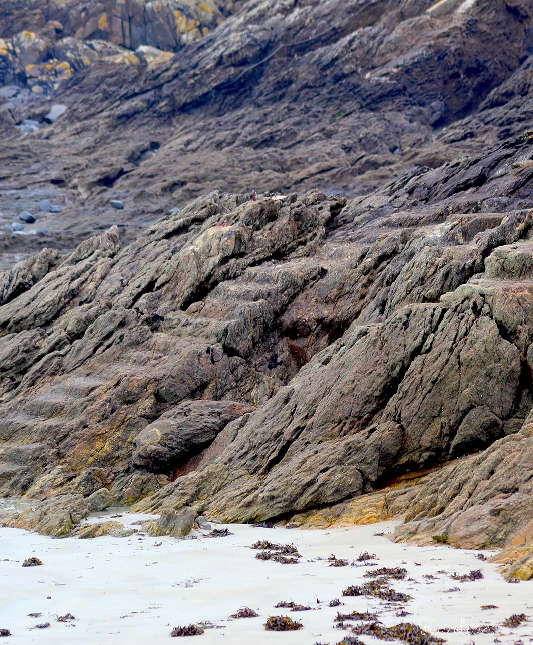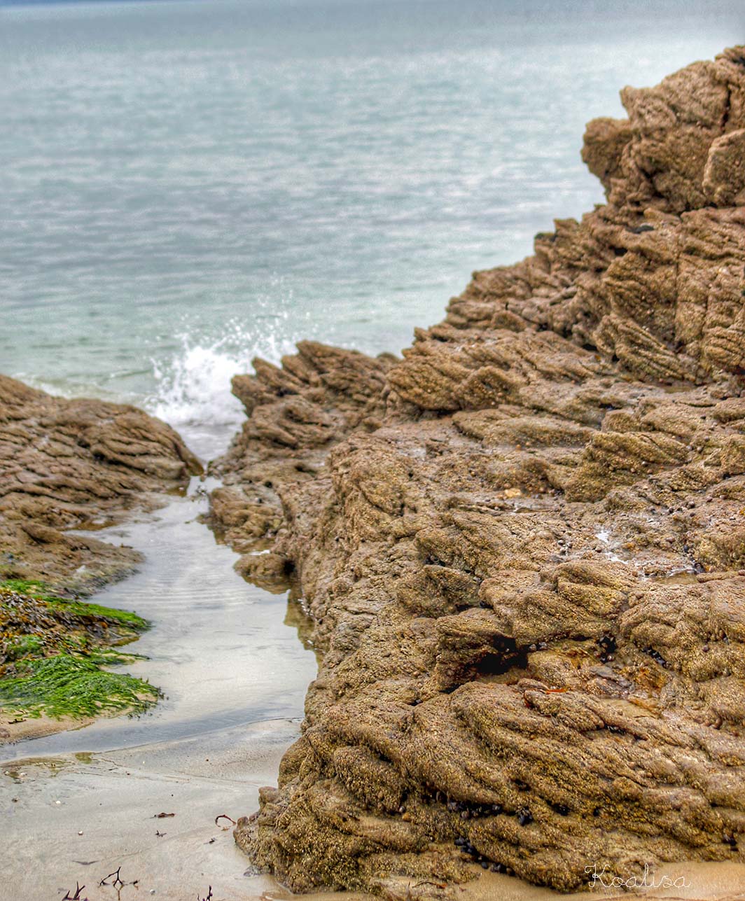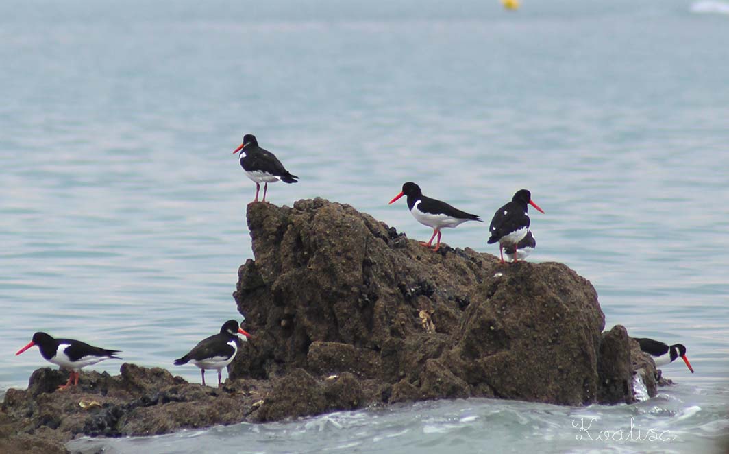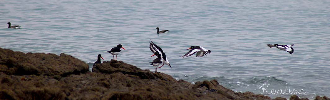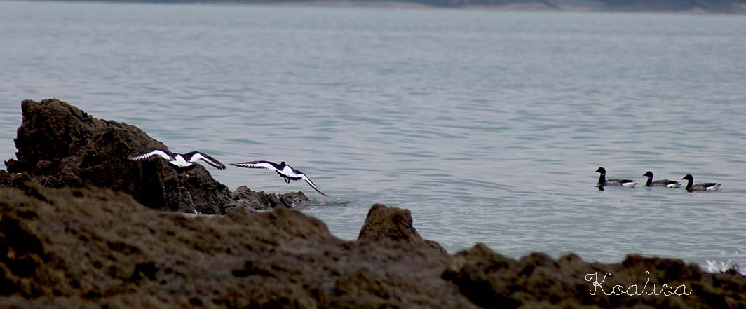 J’ai ensuite longé toute la plage pour me retrouver sur les rochers de l’autre côté, où j’ai aperçu des oiseaux sur l’eau ( des oies bernaches, il me semble… mais je n’y connais rien, elles volaient en triangle quand elles sont parties ). Et puis, il y avait ces drôles d’oiseaux avec un long bec orangé.