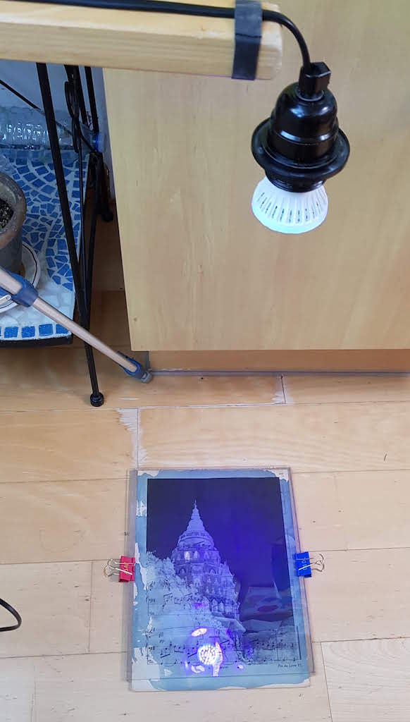 Bonjour et merci pour votre visite.Pour répondre à vos questions : oui, l’installation est assez rudimentaire avec une ampoule à LED UV (basique, par exemple https://www.ebay.fr/itm/E27-Ampoule-UV-Lampe-Lumiere-Noire-LED-Eclairage-Decoratif-Noel-DJ-Bar-Soirees/324309858207?hash=item4b825fb79f:g:UgUAAOSwjJZfWcwh) sur une douille accrochée à un trépied photo. Le temps d’exposition suffisant pour moi était de 18 minutes mais il faut accepter le fait que ce n’est pas une science exacte et qu’on va forcément tâtonner un peu. Une feuille de papier découpée en une douzaine de petits morceaux peut servir de test : on expose un même négatif avec des durées de plus en plus longues pour voir ce qui marche le mieux. On peut aussi rapprocher ou éloigner l’ampoule. Pour moi le temps d’exposition idéal était 18 minutes mais ça ne veut pas dire que ça va être pareil pour vous. C’est ça aussi qui est passionnant…Et puis il y a aussi le problème de faire durer l’image et de stopper le développement une fois que le résultat voulu est obtenu. D’où l’eau oxygénée ! Et je dois dire que mes photos ont très bien tenu. En fait l’idéal est d’utiliser la lumière naturelle du soleil mais c’est vrai qu’en ce moment ce n’est pas forcément facile…