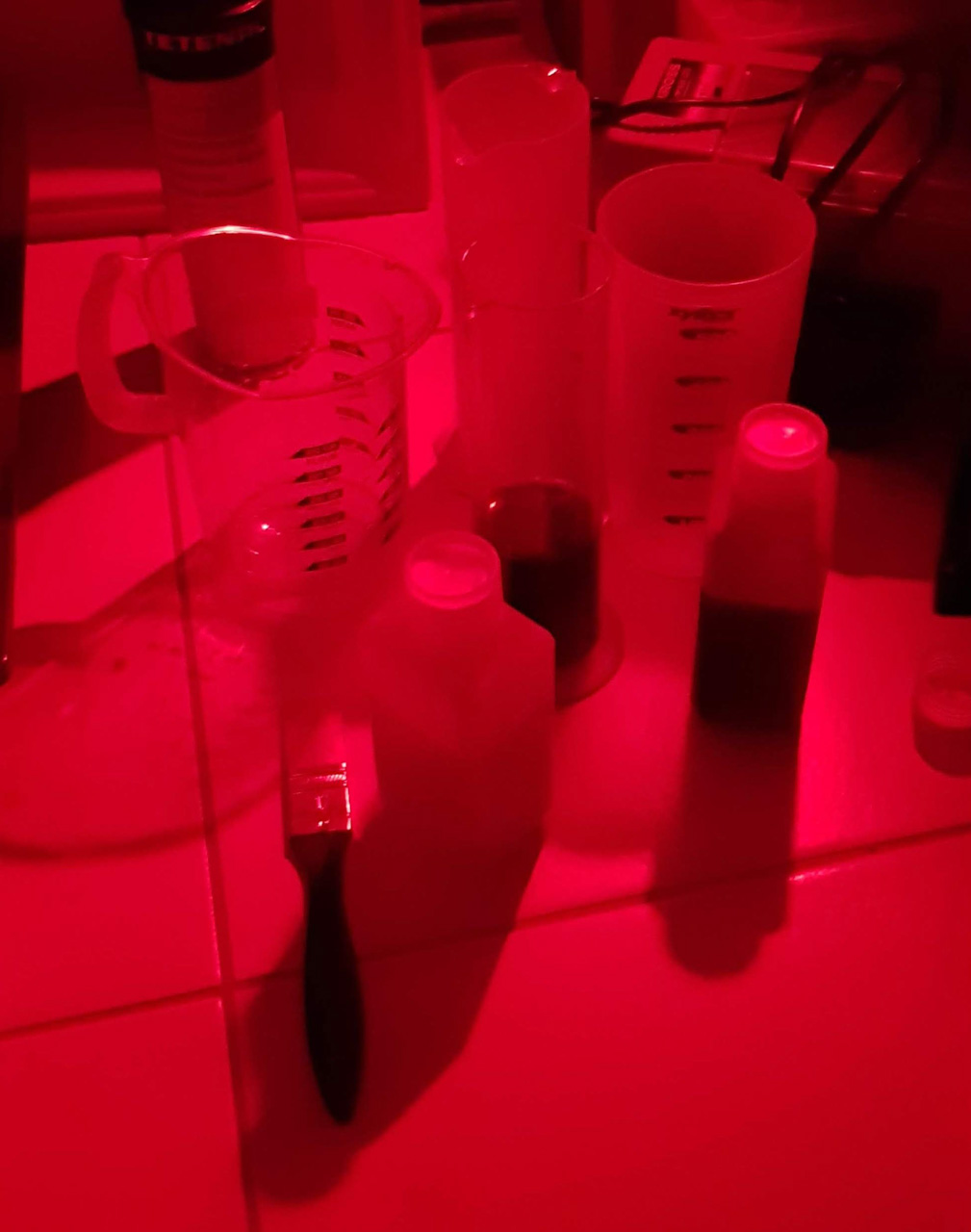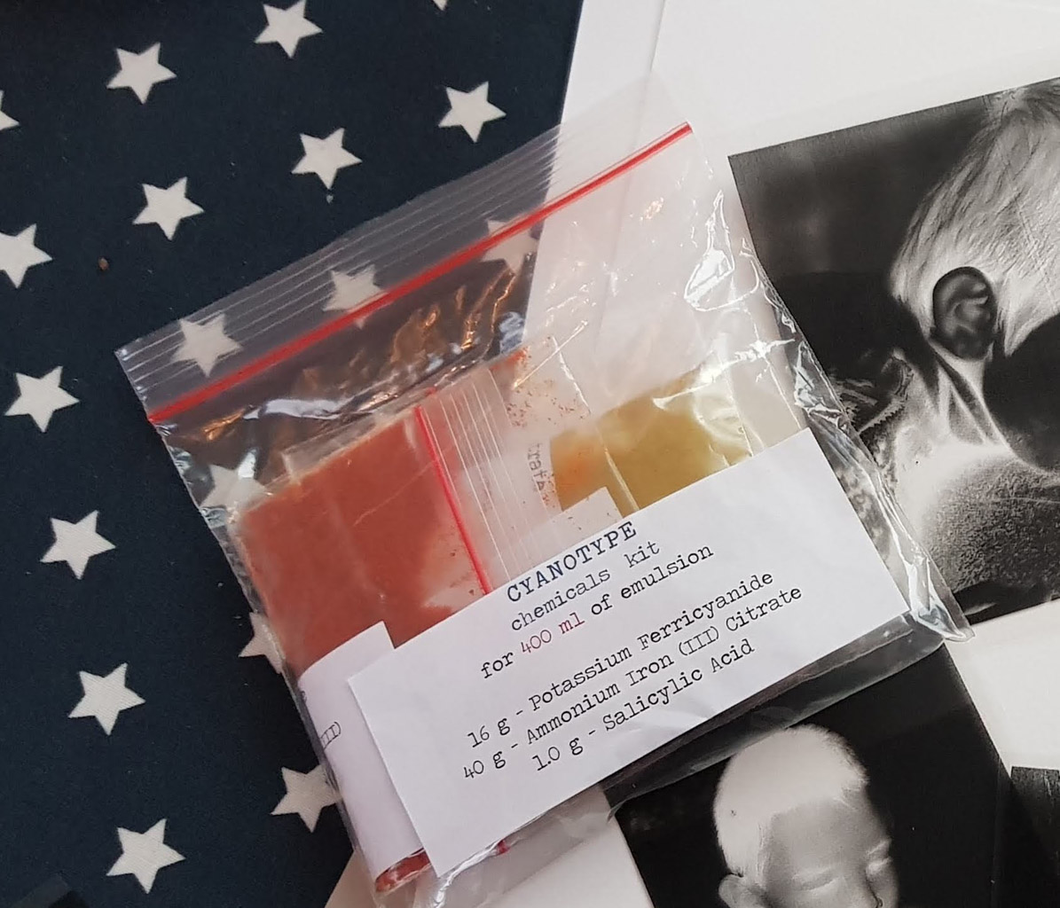 Pour la chimie, c’est un procédé ferrique et non pas argentique.En cherchant un peu, j’ai vu qu’on pouvait se fournir sur le web et j’ai tout simplement acheté un kit cyanotype. J’ai reçu deux sachets, l’un contenant du citrate d’ammonium ferrique (poudre rouge), l’autre du ferricyanure de potassium( poudre verte). J’ai juste suivi les instructions pour mélanger chaque poudre avec de l’eau dans des flacons séparés A et B, puis mélanger A et B à parts égales. Je n’ai pas tout utilisé pour pouvoir refaire une solution si besoin. Mes flacons A et B sont bien fermés et je les conserve dans le noir.