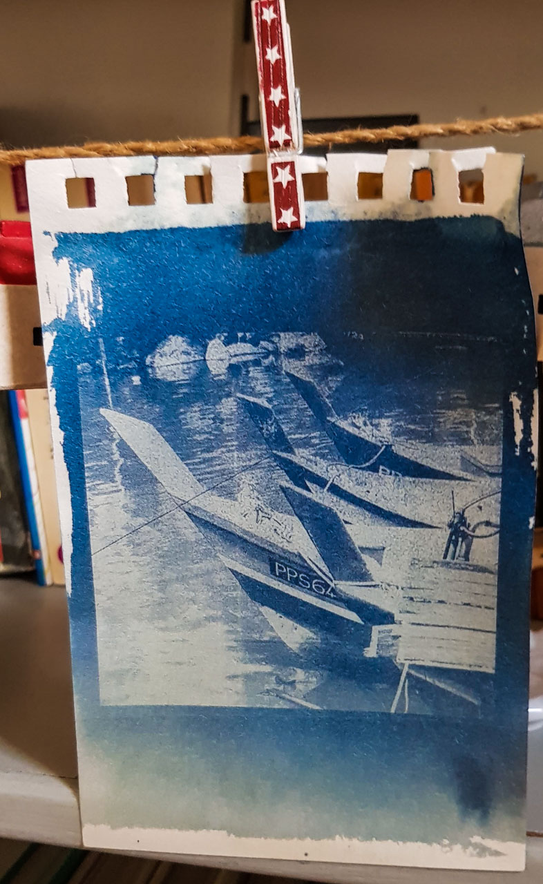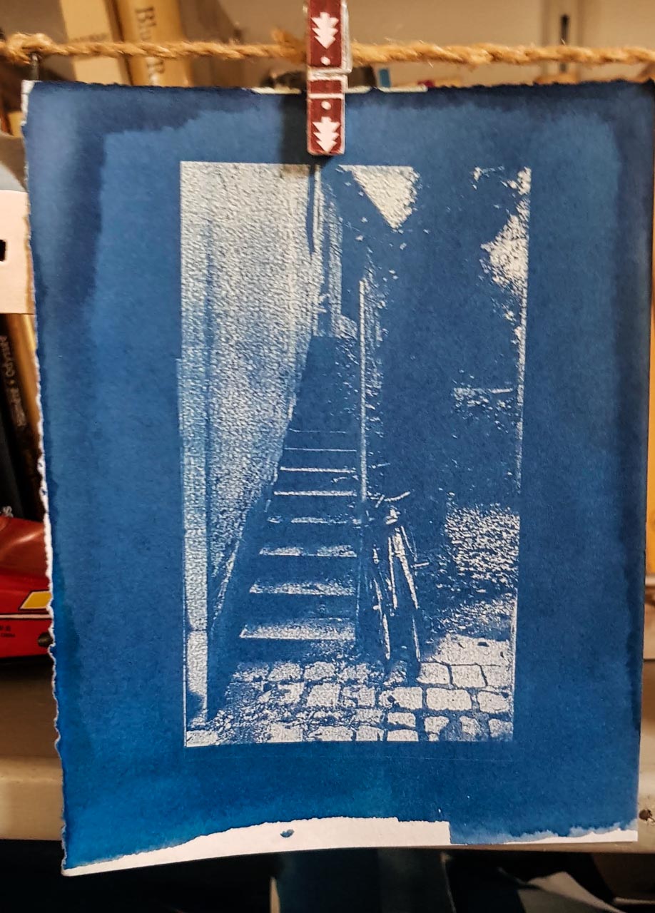 L’étape la plus délicate est finalement la dernière, celle de l’exposition. Il faut en effet exposer le papier (avec le négatif par-dessus) aux rayons UV. Je mets le papier et le négatif sous une plaque de verre en maintenant le tout avec des pinces. Mais au début, comme la luminosité est plutôt basse à cette époque de l’année, je n’arrivais pas ensuite à fixer l’image, elle disparaissait très vite. Finalement j’ai acheté une petite lampe UV (mon mari m’a bricolé une petite installation) et j’ai fait des tests. En fait, 18 minutes d’exposition aux UV suffisent pour moi, dans les conditions de luminosité actuelles. Je crois que ça sera plus facile cet été ! Ensuite il faut rincer le papier à l’eau courante, ce qui révèle l’image, en bleu et blanc, puis on laisse sécher. Au début les tirages avaient tendance à continuer à foncer mais en ajoutant quelques gouttes d’eau oxygénée au rinçage, ça a l’air de tenir.