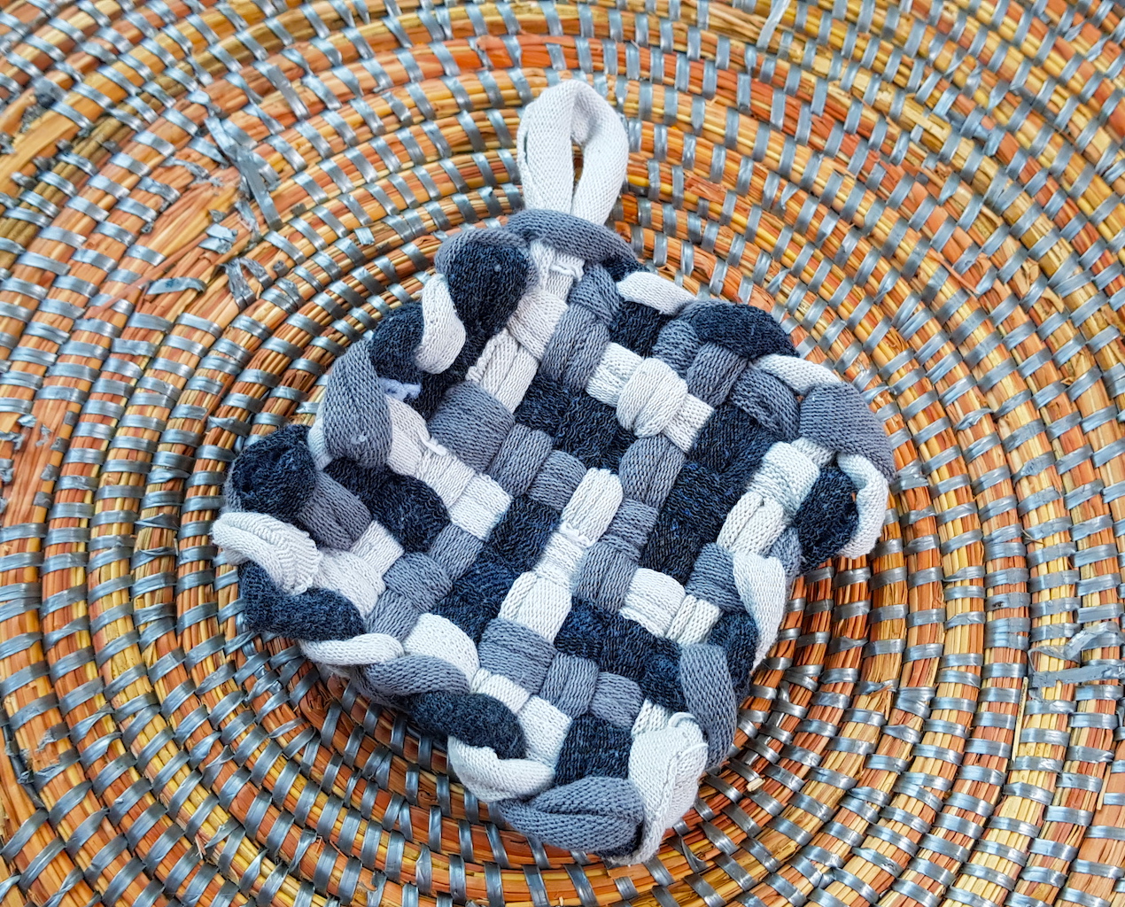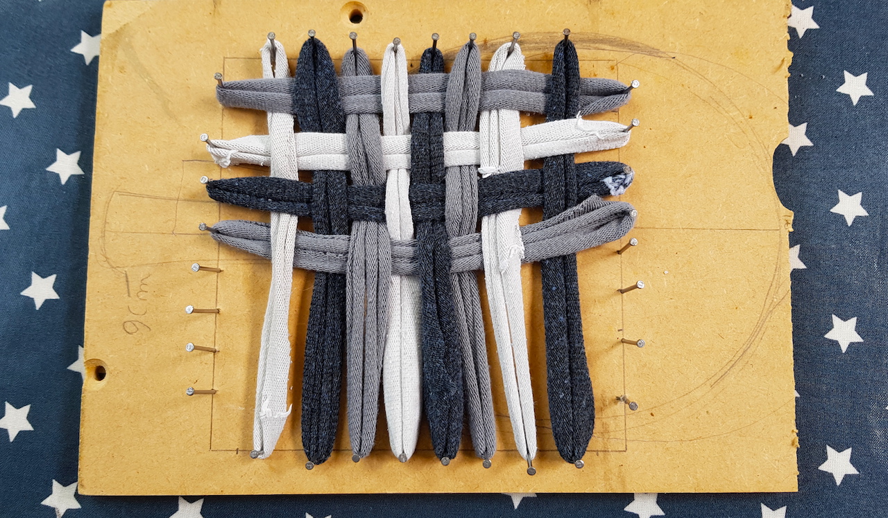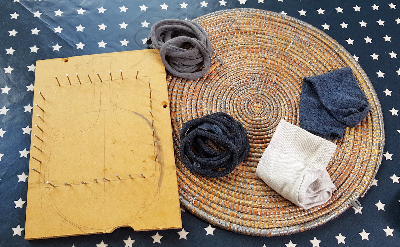 Après il faut découper de vieilles chaussettes ou de vieux collants en lanières de 2 ou 3 cm de large. Il suffit ensuite de les placer comme des élastiques sur le métier à tisser et de tisser les bandes (une dessus, une dessous ). Pour terminer, on enlève les 2 boucles en haut à droite et on en enfile une dans l’autre. On continue en faisant le tour de l’ouvrage et la dernière boucle servira à accrocher le tawashi. On voit bien sur les photos que mes clous ne sont pas en face mais ça a marché quand même…