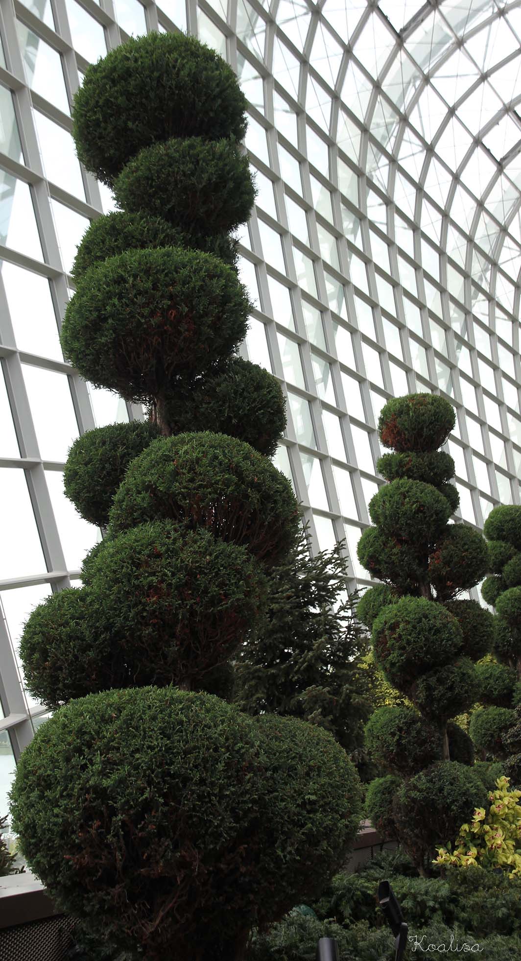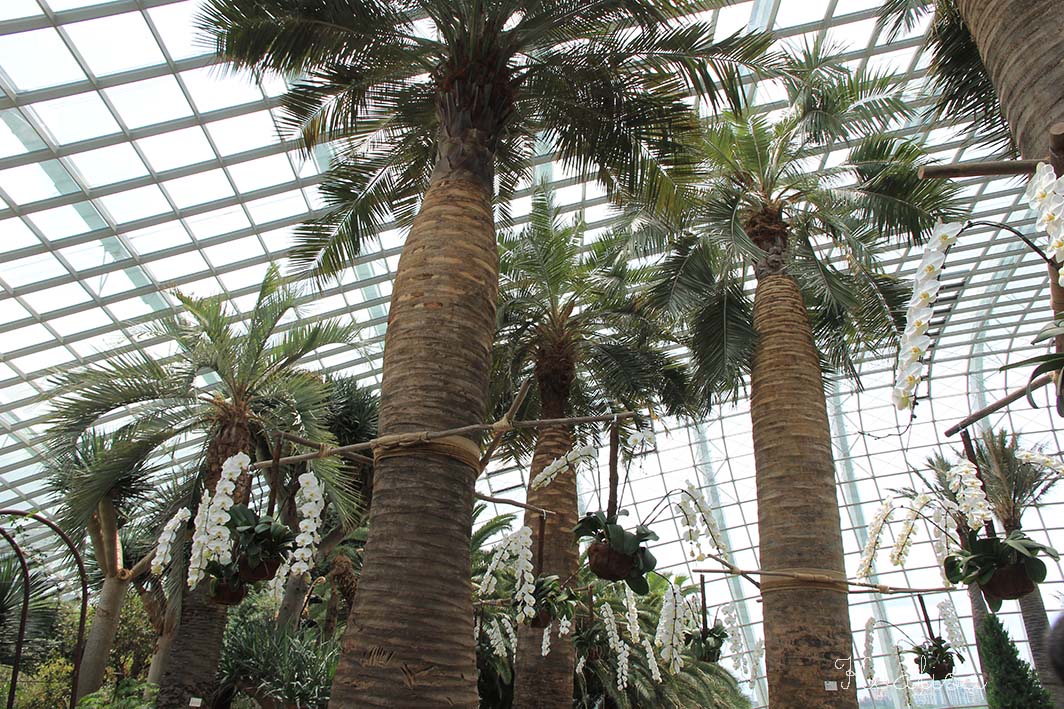 Quelques chiffres pour commencer : le dome est constitué de 3332 panneaux de verre de 42 formes et tailles différentes couvrant une surface de 16000 m2…La serre du Flower Dome occupe 1300 m2 et il y règne une température fraîche (23 à 25°, ce qui est frais pour Singapour). C’est le printemps toute l’année.