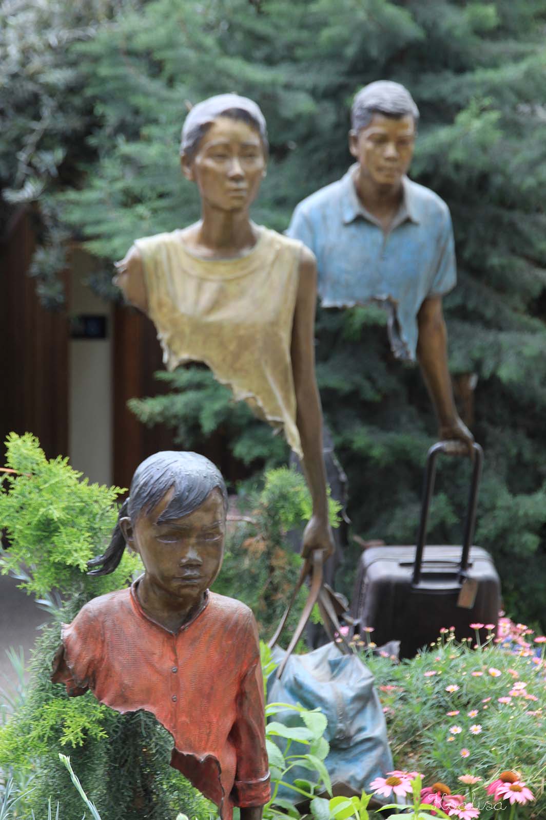 L’espace est également ponctué d’ oeuvres d’art. J’ai beaucoup aimé cette sculpture de l’artiste français Bruno Catalano placée au milieu des fleurs. Elle s’appelle la Famille de Voyageurs.