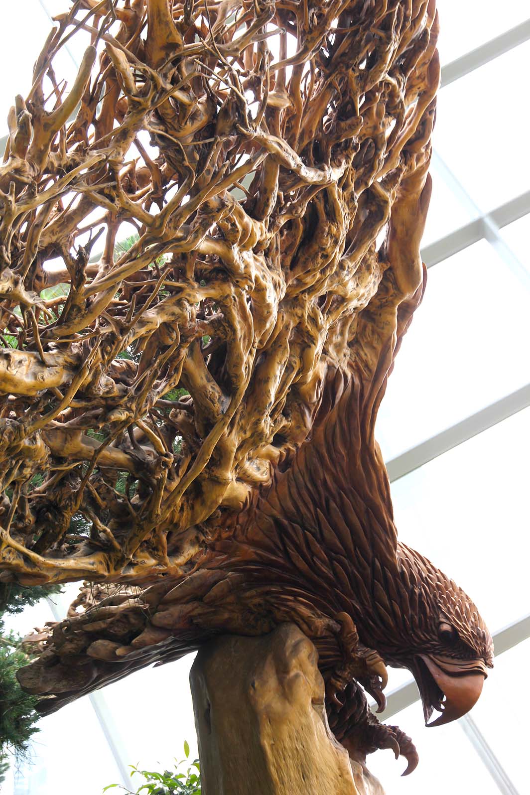 Ailleurs on peut admirer des sculptures végétales en racines de litchi, comme ce dragon et cet aigle (Canaillou a bien aimé !).