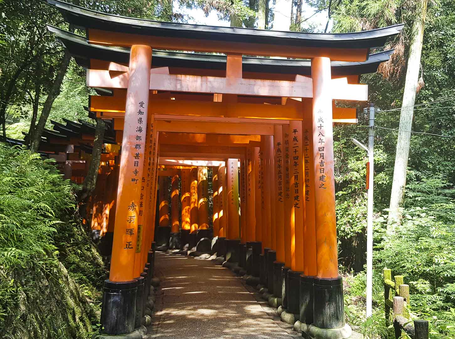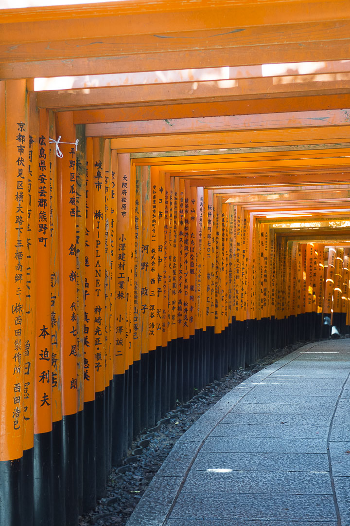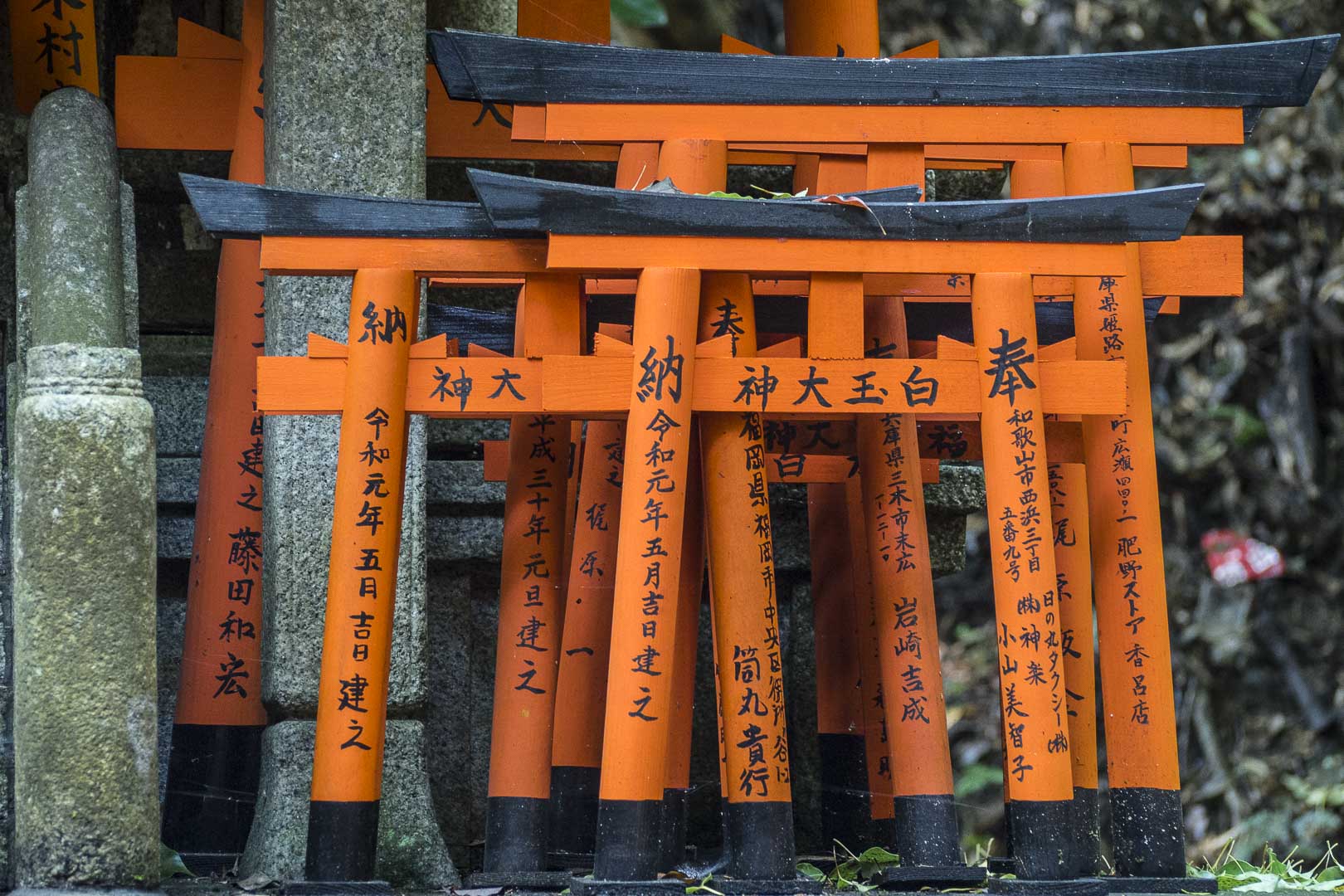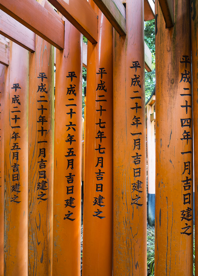 Les torii sont couverts d’inscriptions indiquant les noms de leurs donateurs, particuliers ou entreprises. On peut en effet faire don d’un torii au sanctuaire, le prix varie suivant la taille du torii (il y en a des tout petits !).