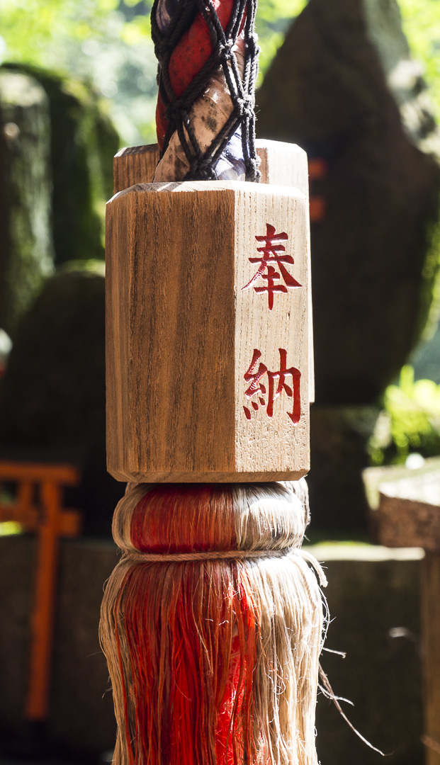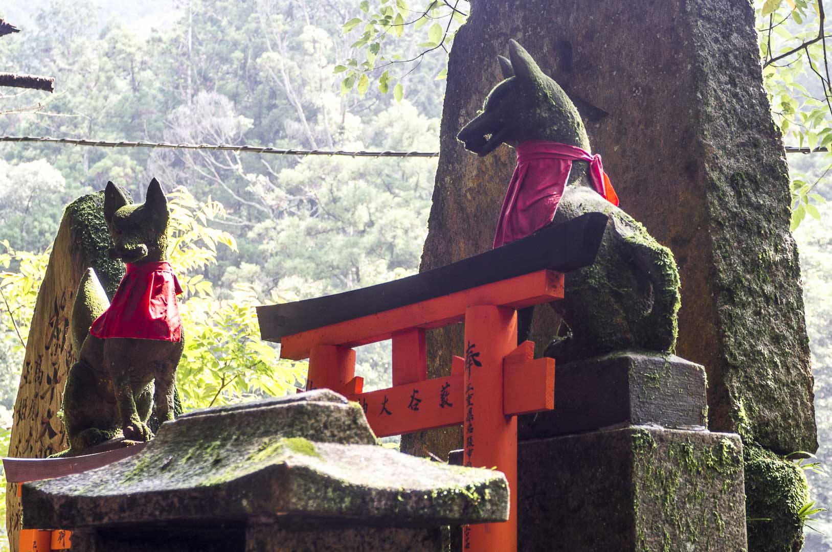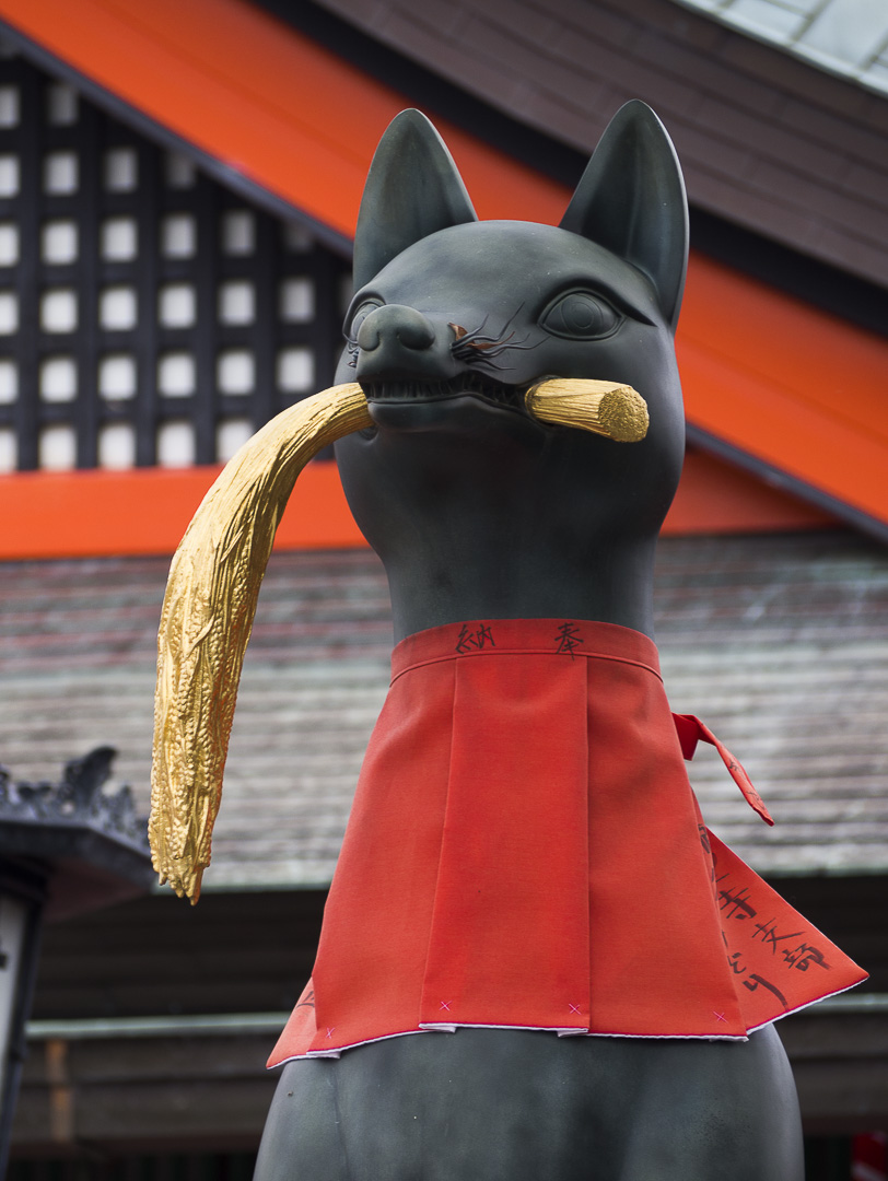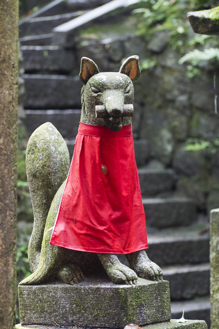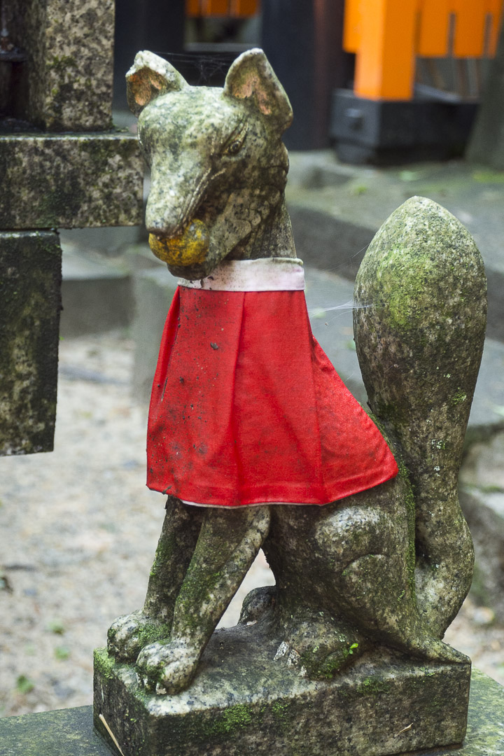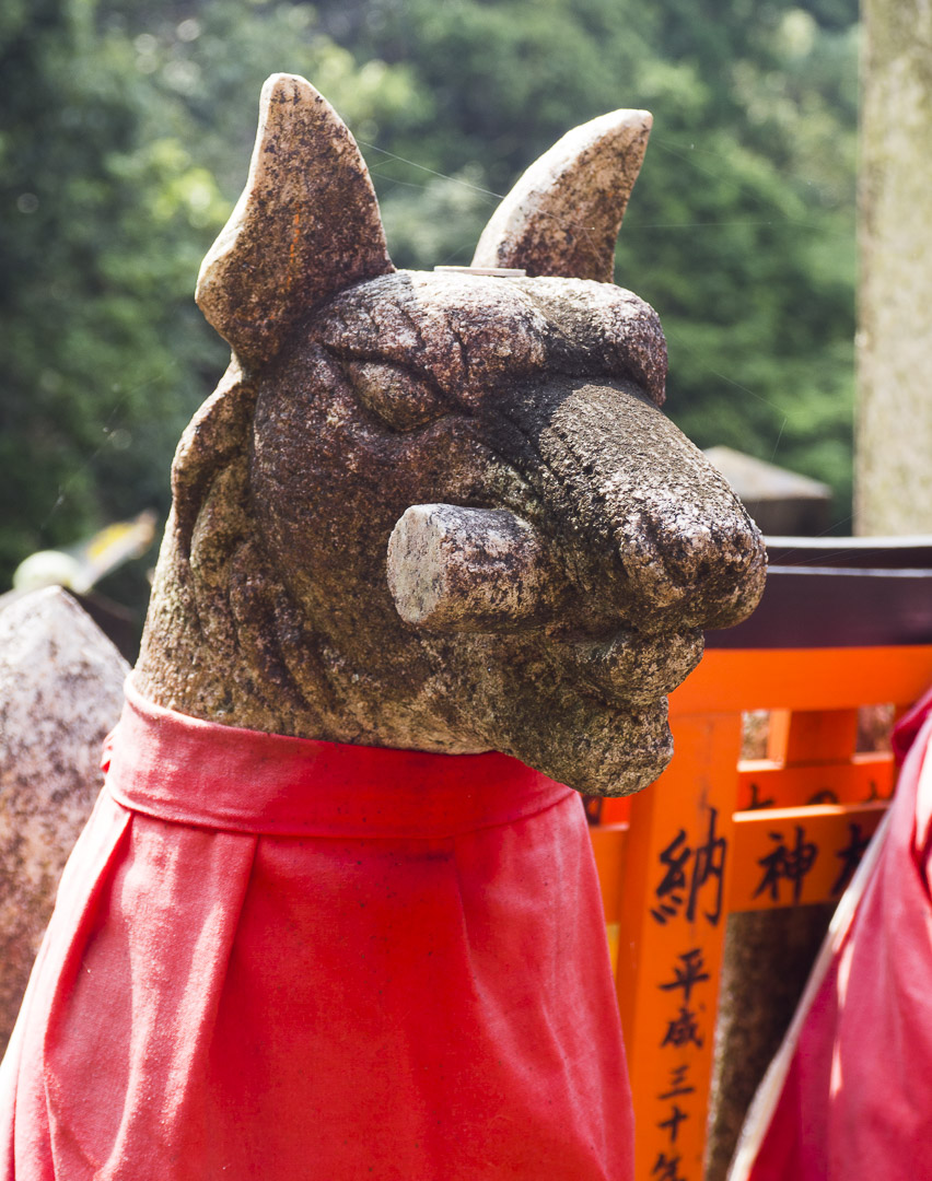 On croise un peu partout des statues de renards arborant des bavoirs rouges (odarekake) offerts par des fidèles en signe de respect. Ces fidèles ont souvent perdu un enfant, et le bavoir rouge sur les statues est censé protéger les enfants dans l’au-delà. Certains Kitsune paraissent un peu menaçants et je pense qu’à la tombée de la nuit l’ambiance doit être tout autre ! Ils tiennent dans leur gueule un rouleau, une gerbe de pousses de riz,une perle ou la clé du grenier à riz.