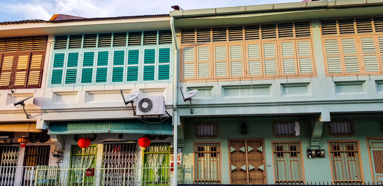 Cette fois, pas d’hôtel mais une maison louée via Airbnb dans le centre historique de Georgetown, la ville principale de Penang. Nous étions au numéro 12 sur la photo ci-dessus. C’est une maison à l’architecture chinoise traditionnelle mais réaménagée avec la climatisation et tout le confort (et un parking gratuit !). Nous nous y sommes beaucoup plu, et en plus nous avions la possibilité de cuisiner pour Canaillou qui avait fait quelques écarts alimentaires à Langkawi…Quant à nous nous avons profité de la cuisine indienne et malaise et nous sommes régalés de plats achetés chez les street hawkers, miam !