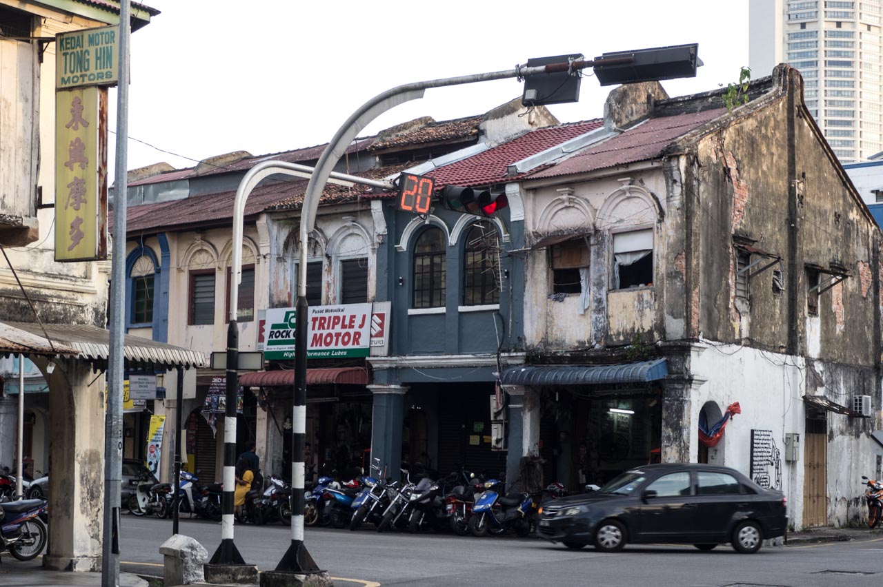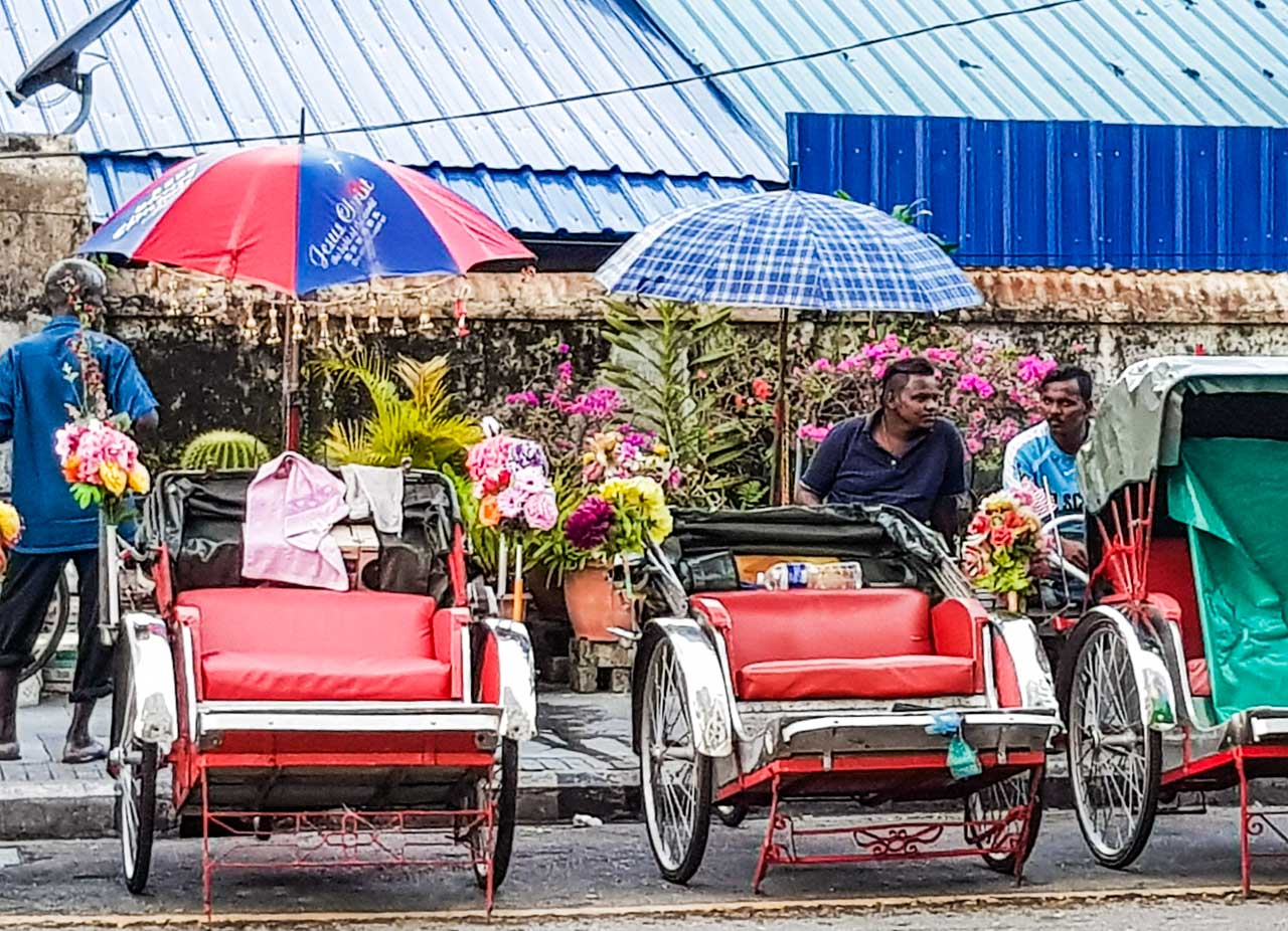 J’ai été frappée par l’état de grande décrépitude de beaucoup de maisons dans le centre historique de Georgetown. Ce dernier est classé au patrimoine mondial de l’Unesco depuis 2008 et est en cours de rénovation, heureusement mais il reste encore du boulot…Penang a beau être à la pointe de l’industrie, le centre historique de Georgetown est très touristique et on y trouve des vestiges d’une autre époque, notamment les rickshaws ( tuk-tuk). Personnellement, l’idée de me faire trimballer par un autre être humain qui court ou qui pédale ne m’a pas tentée du tout mais beaucoup de touristes semblent apprécier.