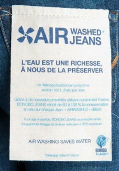 Par exemple, la marque de vêtements Bonobo, je n’ai rien contre, a priori…mais quand on me dit qu’ils « économisent » jusqu’à 100 l d’eau en délavant leurs jeans grâce au nouveau procédé « airwashed », je suis un peu dubitative. Ils les délavent comment, leurs jeans, maintenant ? Je vous le donne en mille: « grâce à un nouveau procédé utilisant notamment l’ozone »…On n’en sait pas plus, quid des nouveaux produits qui sont peut-être toxiques ? Il faudrait peut-être d’abord penser à consommer moins ?