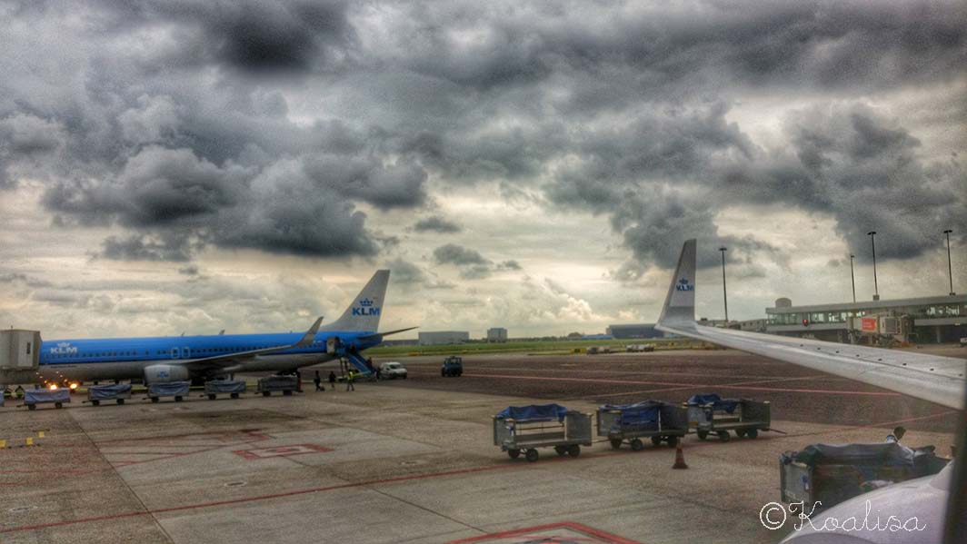 C’est à Roissy que les choses ont commencé à se gâter. Le vol Air France qui était soi-disant maintenu a été remplacé par un vol Hop, partenaire d’Air France. Mais nous avons embarqué avec presque 2 heures de retard ! Evidemment, bien qu’on nous ait promis que nous allions avoir notre correspondance pour Kuala Lumpur, bien qu’on nous ait dit que nous allions être attendus par un agent à l’arrivée du vol, il n’y avait personne à l’aéroport d’Amsterdam pour nous accueillir. Nous avons sprinté comme des malades avec notre pauvre Canaillou mais l’avion pour Kuala Lumpur venait de partir quand nous sommes enfin arrivés à la porte d’embarquement.
