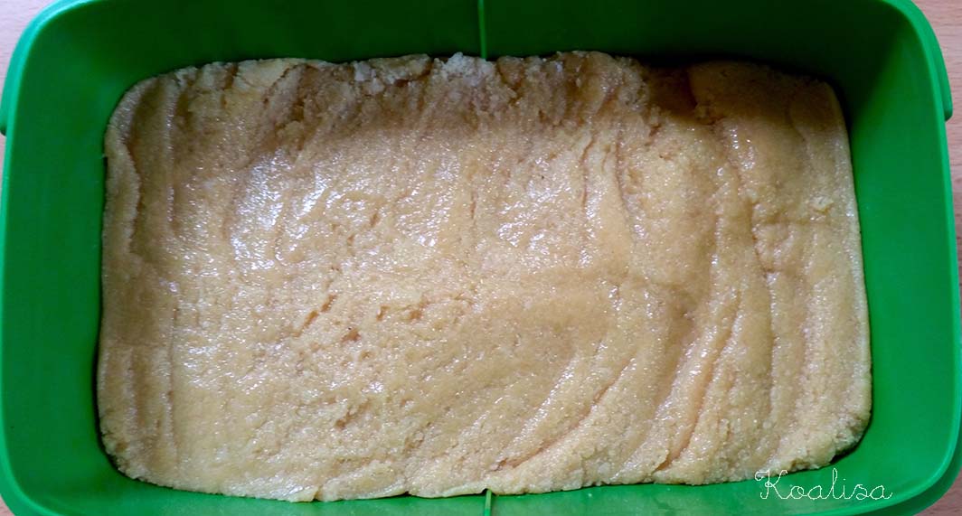 Eteindre le feu et ajouter la semoule de blé, puis le tahin et la poudre d’amandes. La pâte doit être homogène et épaisse. Etaler dans un petit plat ou un Tupperware sur environ 3 cm de hauteur.