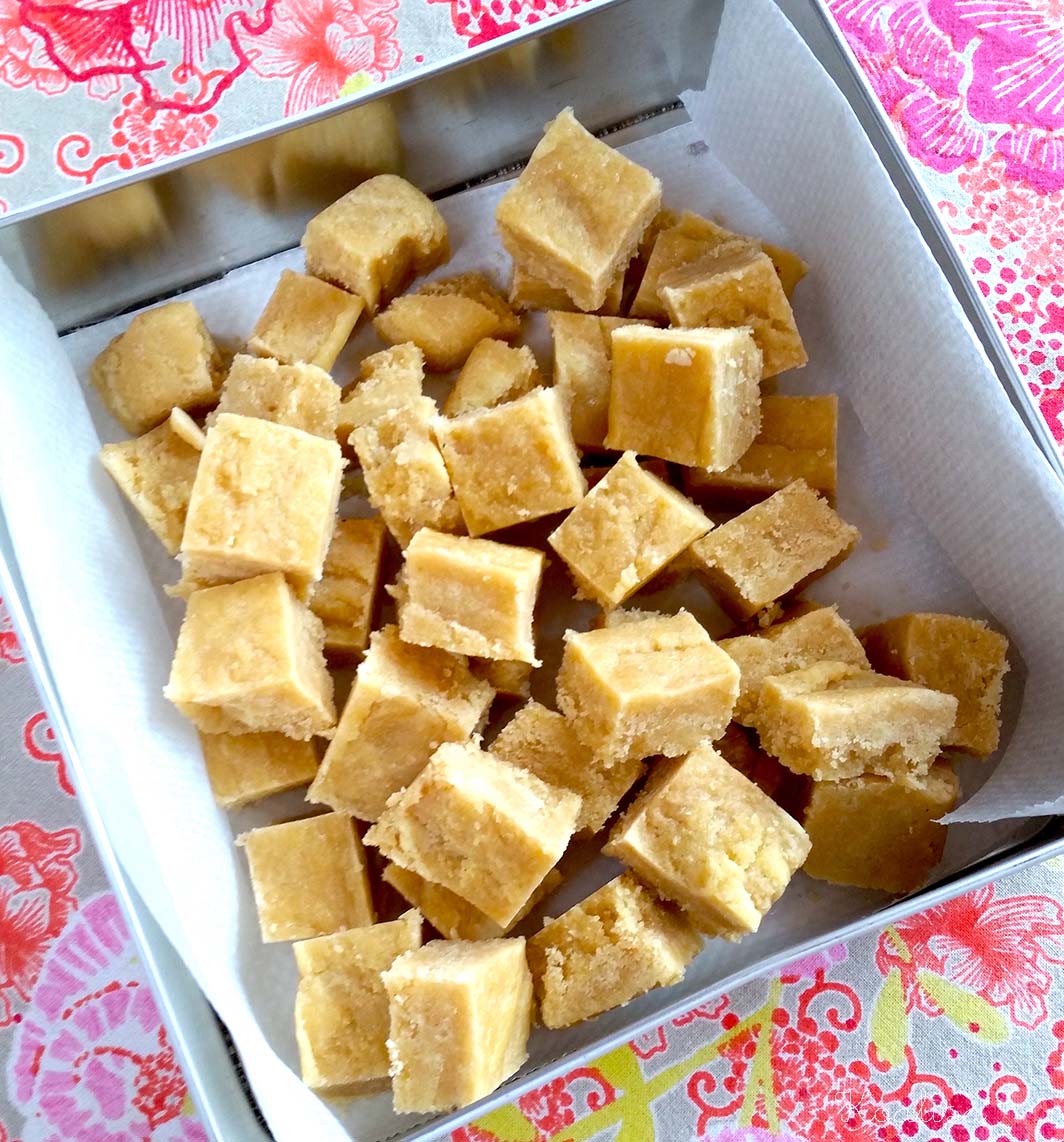 Laisser refroidir et mettre une nuit au frais (ou au moins quelques heures…). Démouler et couper en petits carrés.