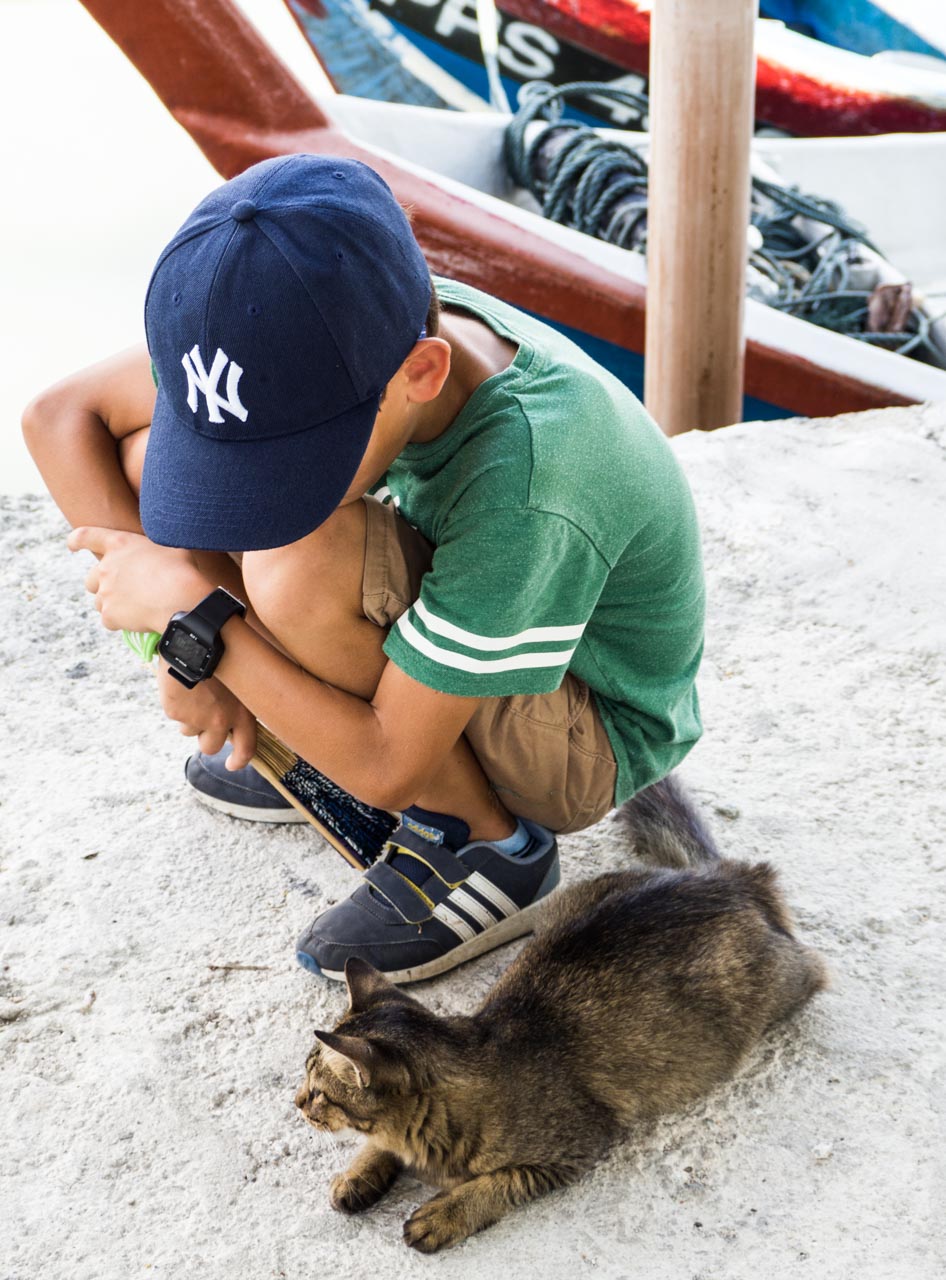 Un joli chat s’est approché. On en a vu pas mal car évidemment les pêcheurs leur donnent un peu de poisson. celui-ci voulait se faire caresser et est devenu assez copain avec Canaillou…