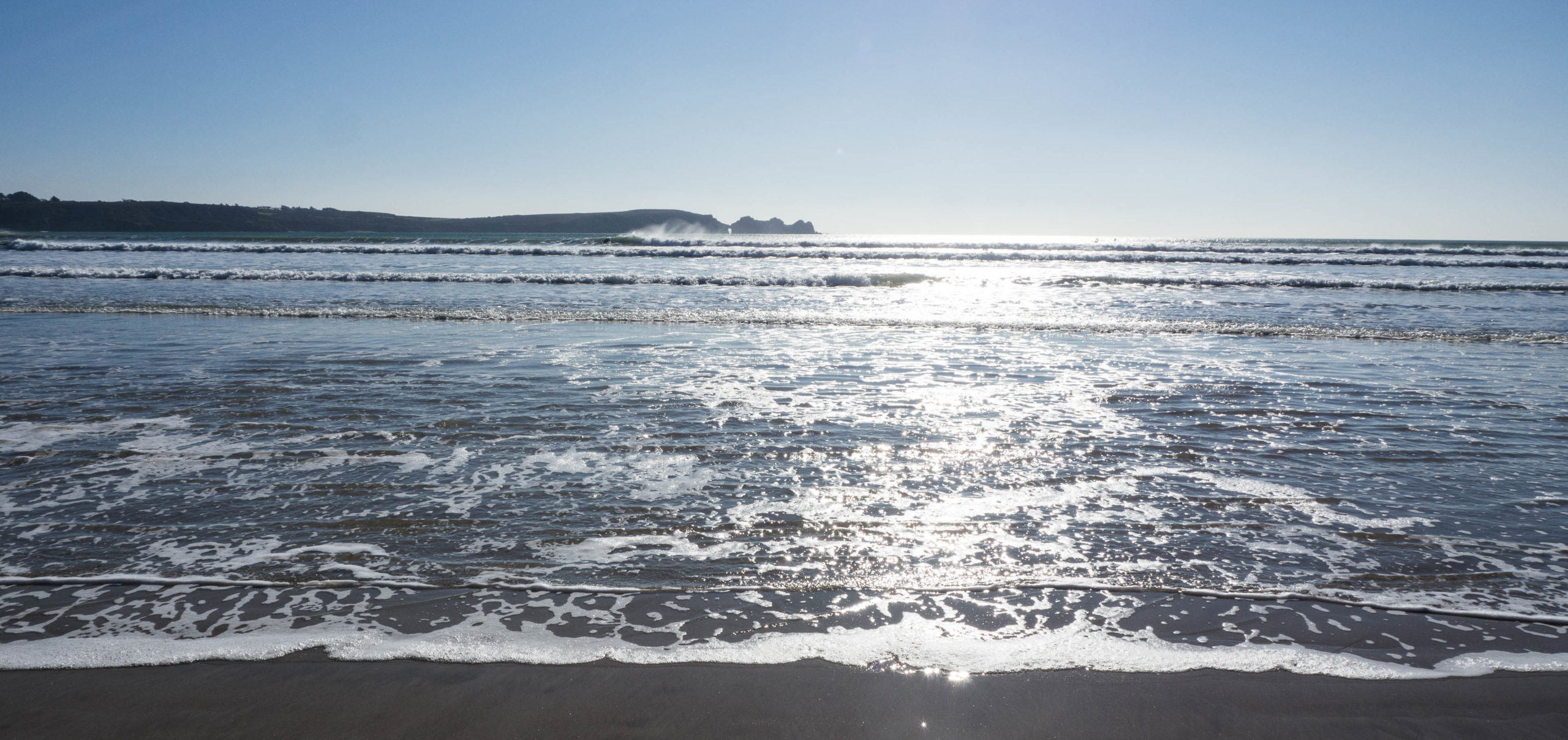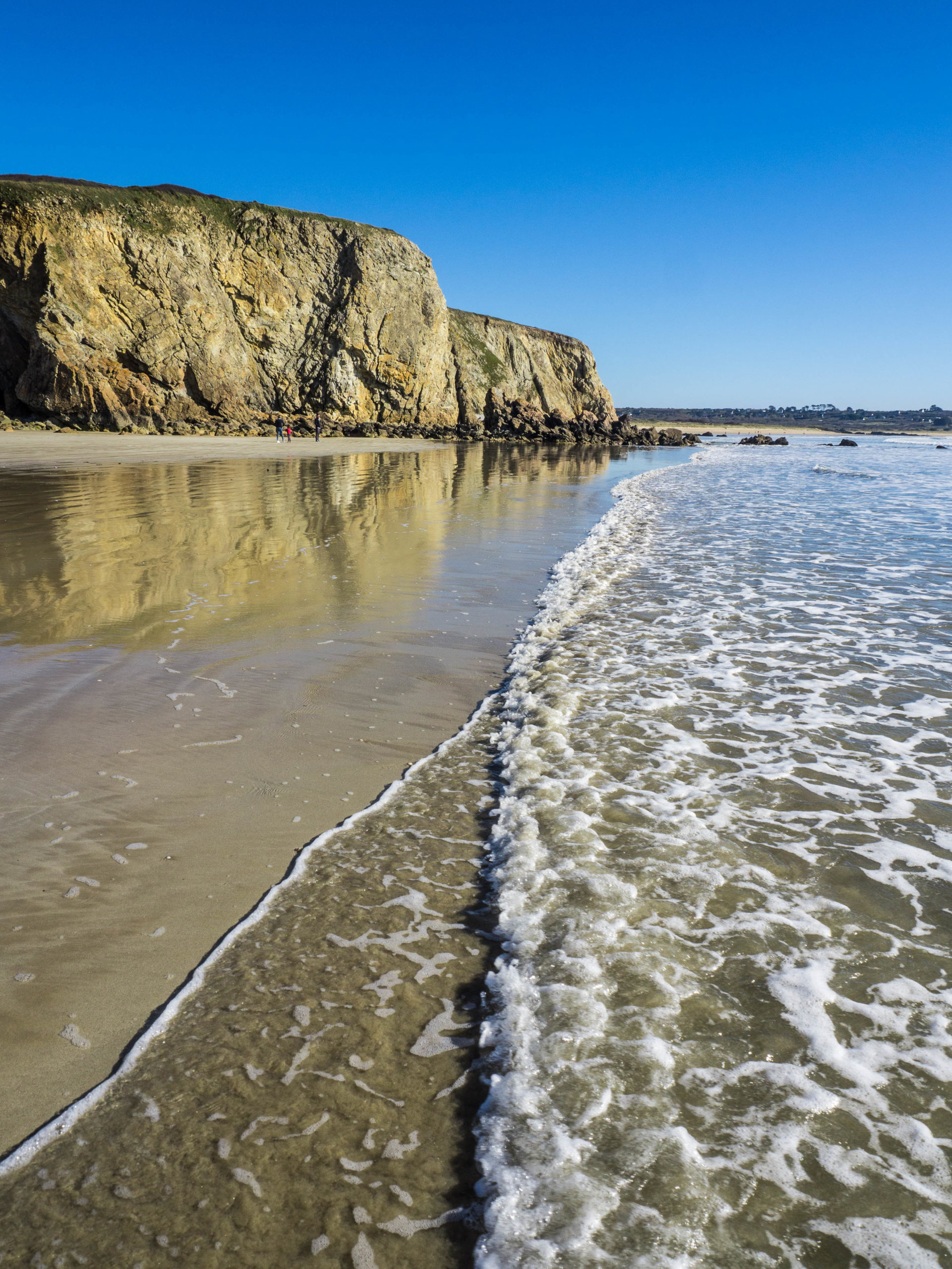 La grande falaise qui borde la plage me fascine, j’essaie toujours de la photographier sous un angle différent… Ce jour-là, elle se reflétait dans l’eau et je me suis pris une vague en faisant la deuxième photo ci-dessous !