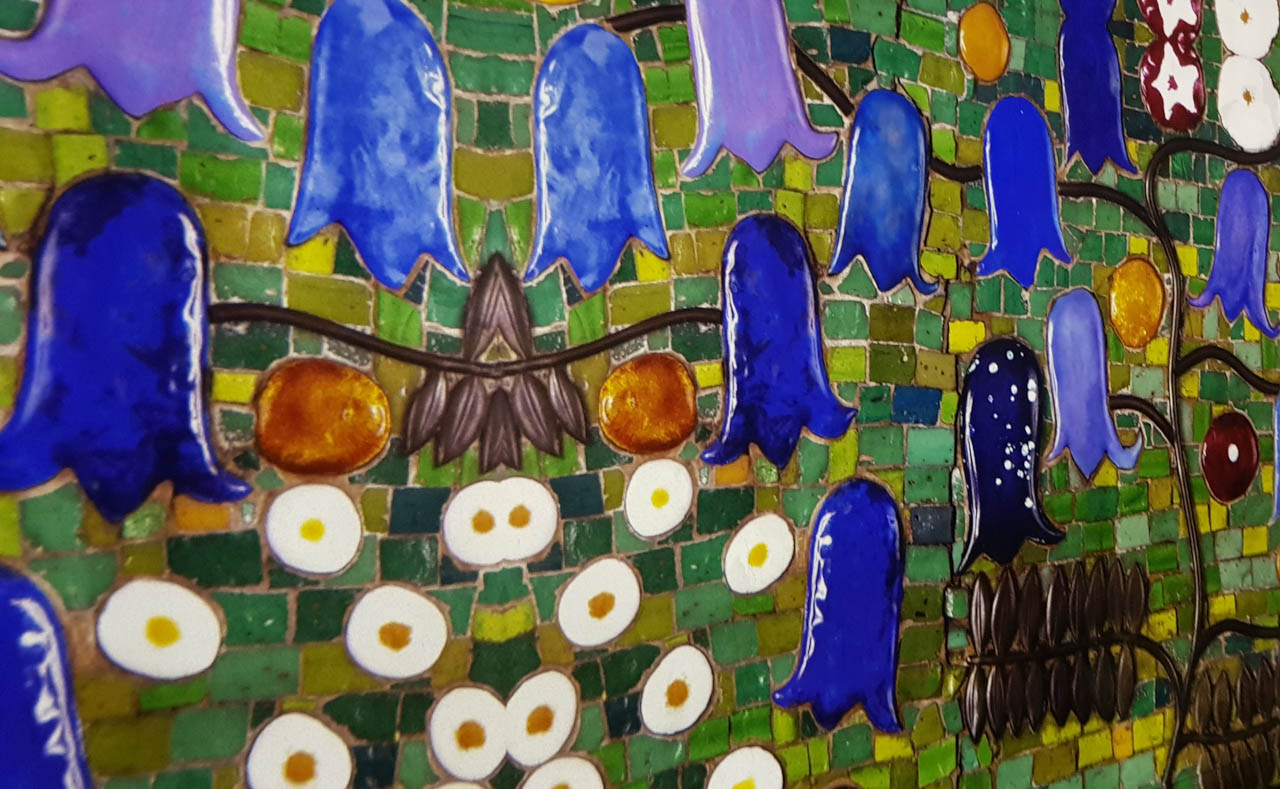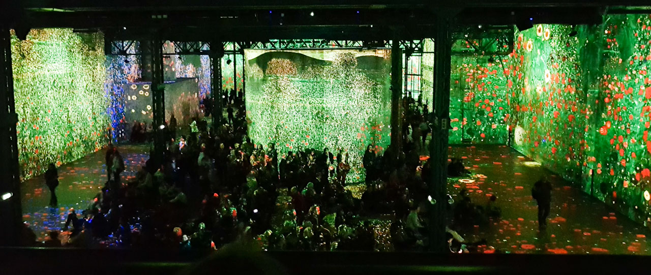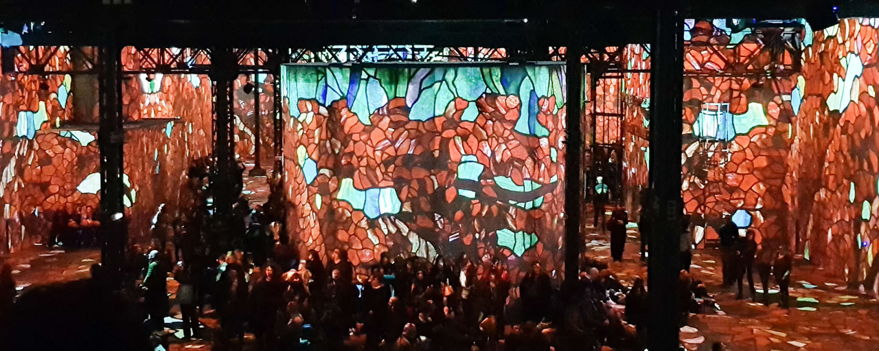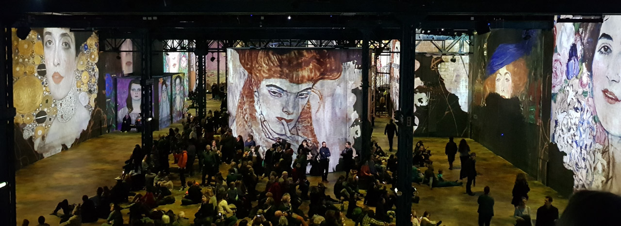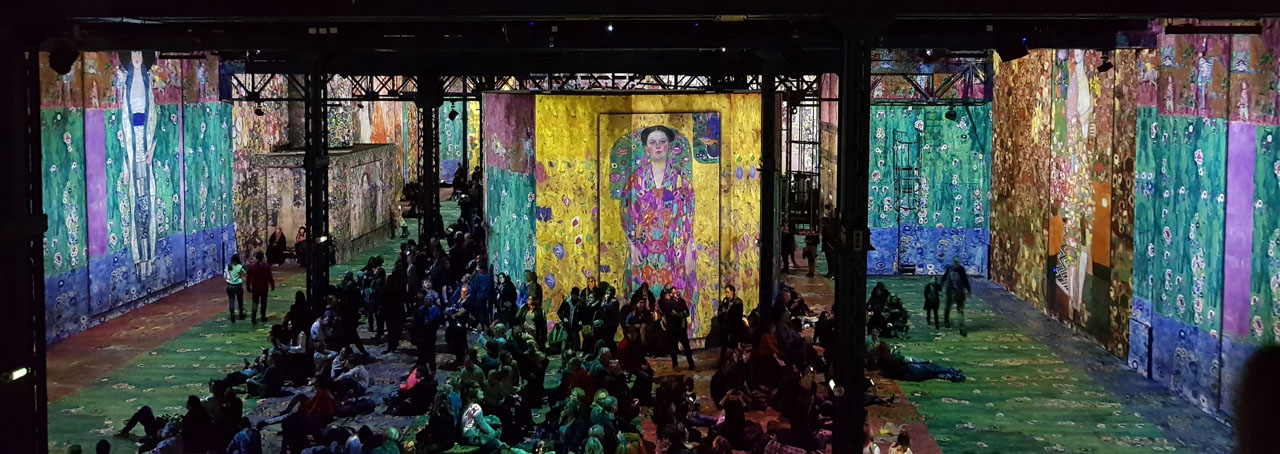Les murs, le sol et le plafond se recouvrent des motifs colorés et des dorures chers à Klimt, c’est une expérience pleine de poésie créée sur mesure pour ce lieu qui était autrefois la fonderie du Chemin-Vert. Après avoir servi à exposer des machines-outils, la grande halle est maintenant devenue un centre d’art numérique.