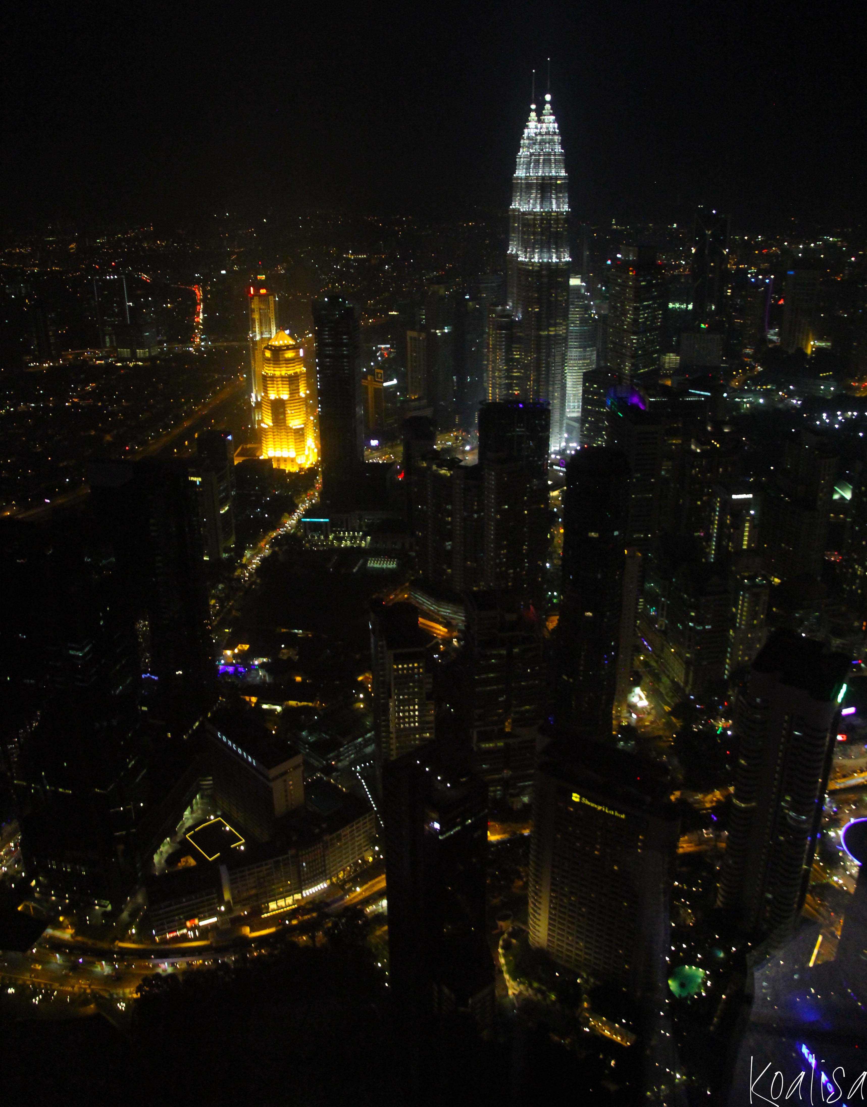 L’ascenseur nous a rapidement amenés jusqu’au sommet (et quand je dis rapidement, c’est en moins d’une minute ! ) et là nous avons pu admirer tout Kuala Lumpur, y compris les tours jumelles. Par contre, pour faire de jolies photos, c’est une autre histoire car la KL Tower est illuminée dedans comme dehors et il y a beaucoup de reflets…
