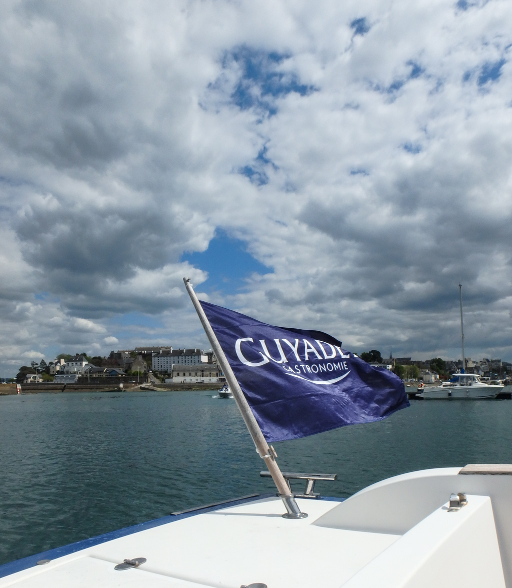 Nous avons pris l’apéritif (signé Guyader bien sûr , avec un cocktail sans alcool répondant au doux nom de Délice des Iles )puis déjeuné avec une vue sublime sur la baie de Douarnenez, ce qui nous permis de garder un oeil sur la course.