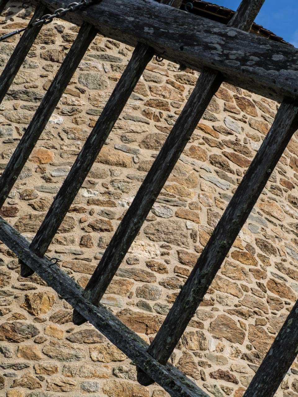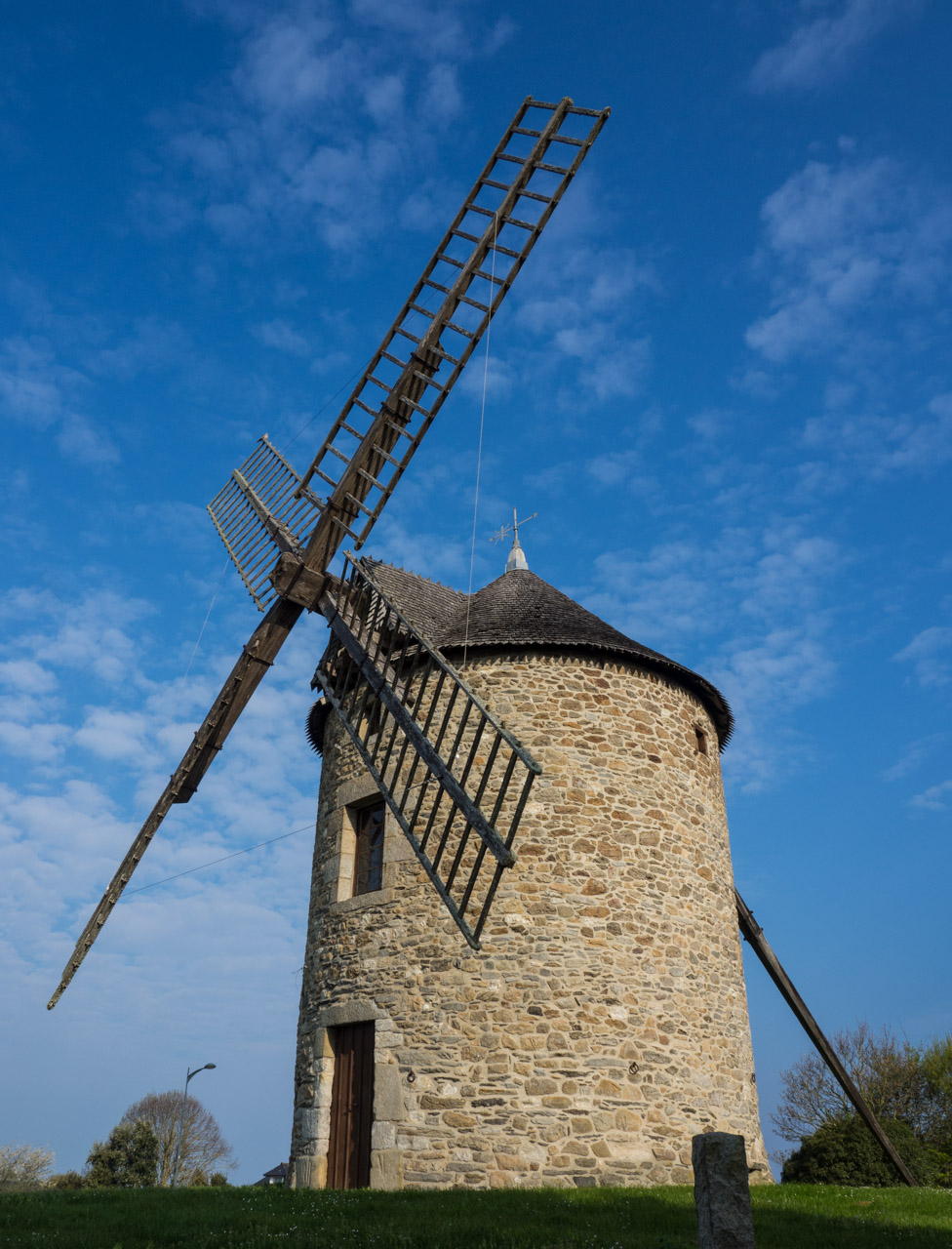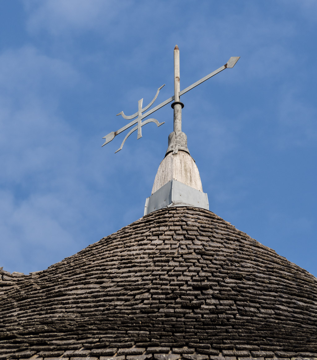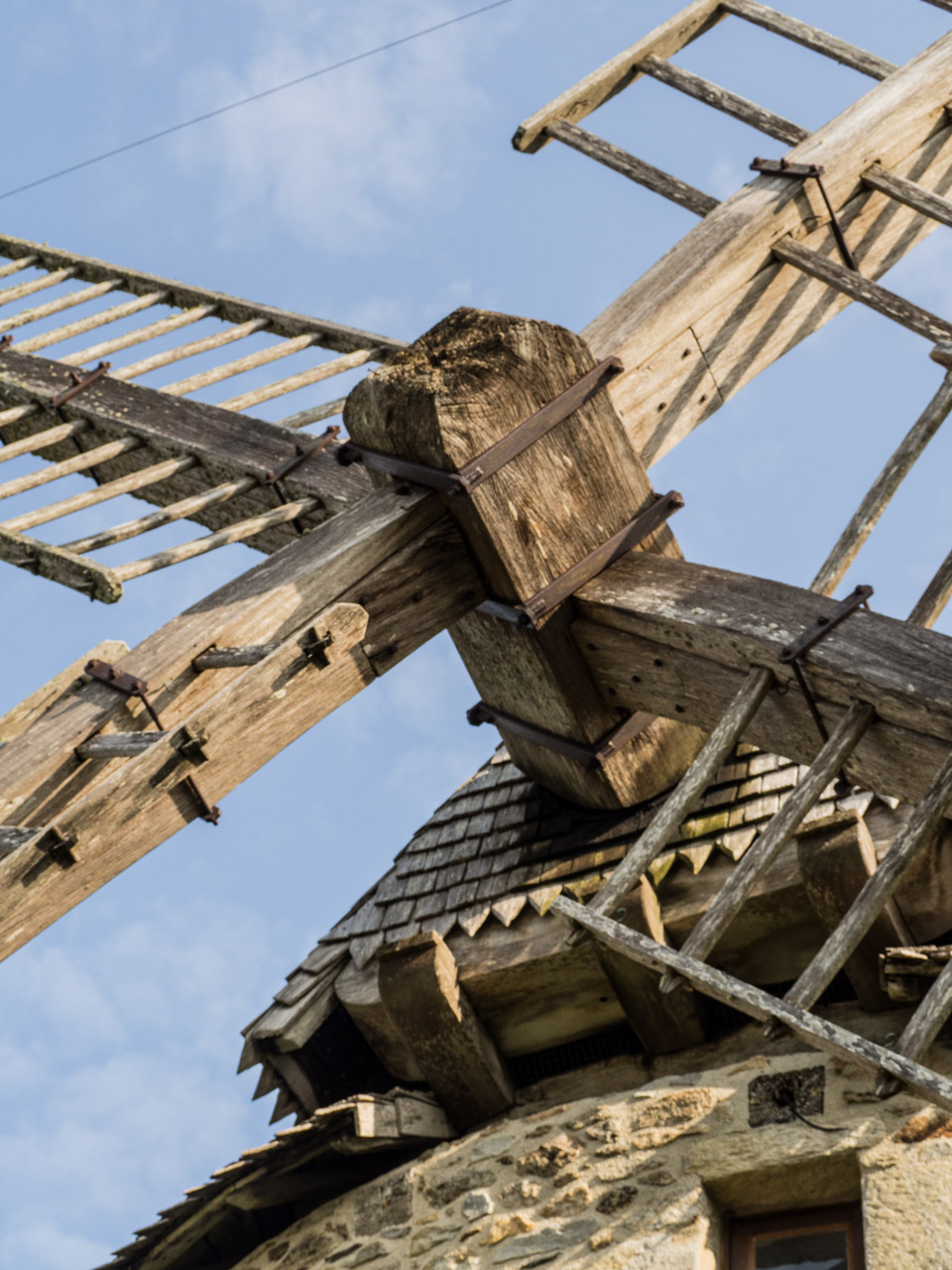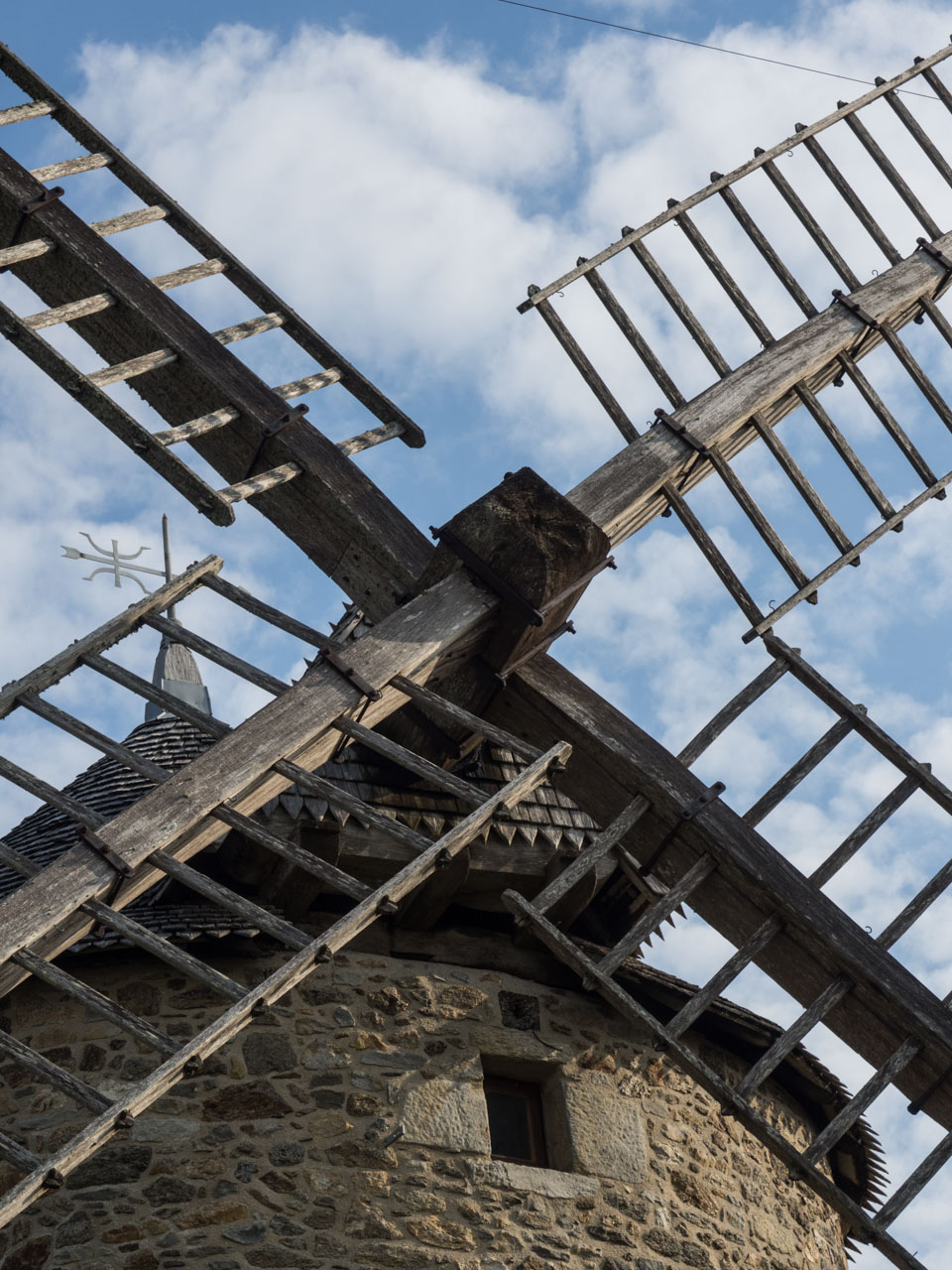 Une petite ouverture en haut du bâtiment permet d’observer la direction du vent. Une lucarne nommée “houteau” reçoit le frein et la queue ou gouvernail du moulin pour orienter la charpente mobile au vent.