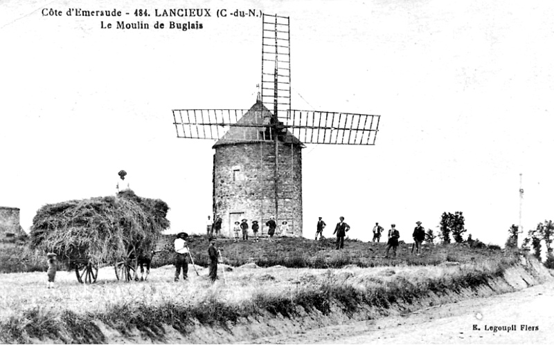 Tout comme le vieux clocher, le moulin de Buglais est un des trésors du patrimoine de Lancieux. Quand on arrive à Lancieux depuis Ploubalay, il semble fièrement monter la garde. Ce monument historique, aussi appelé Moulin des Bénédictins fut construit au XVIème siècle par les moines de l’abbaye de St-Jacut-de-la-Mer. St-Jacut se trouve sur la côte juste en face de Lancieux et les moines ne pouvaient accéder au moulin qu’à marée basse.