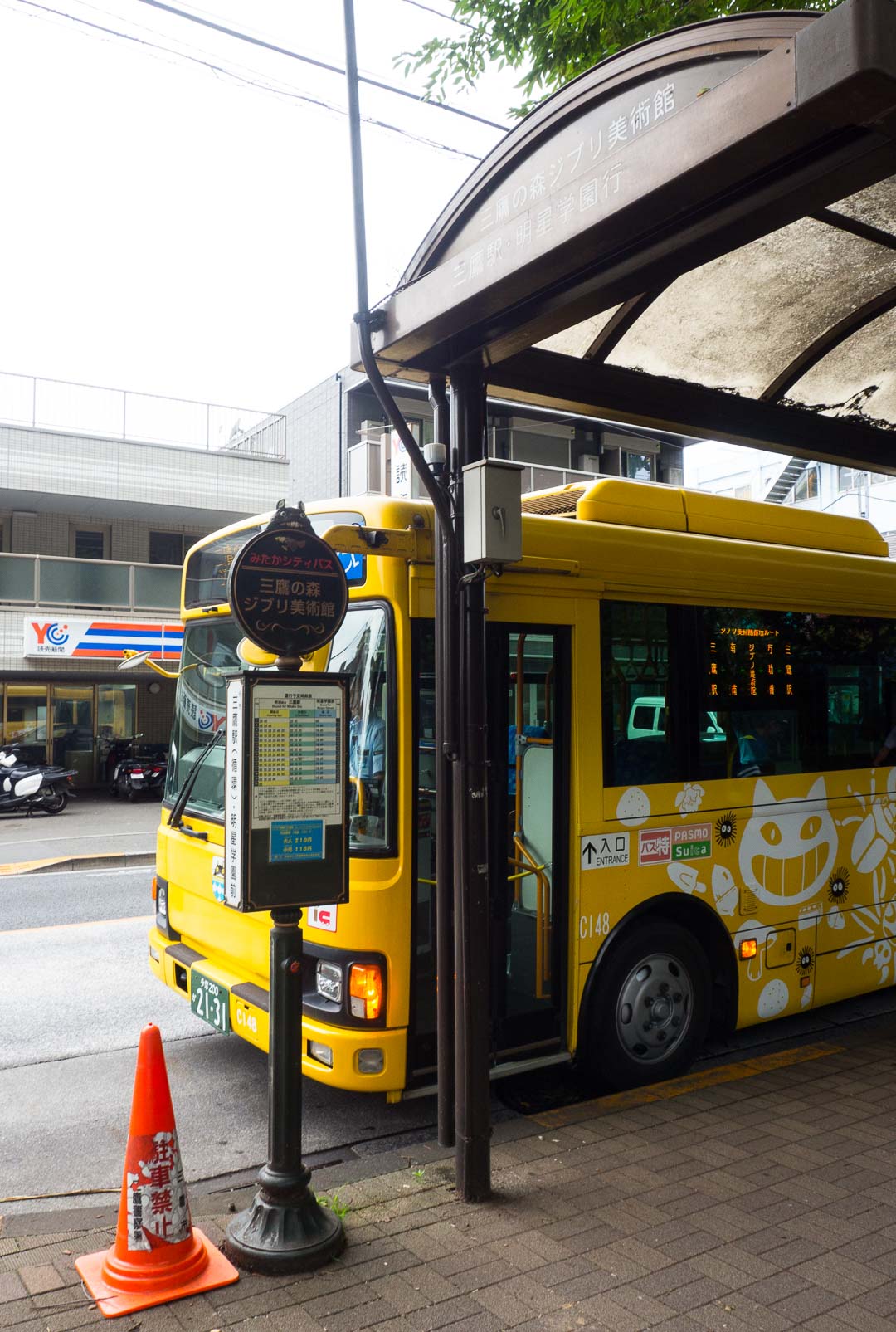 Une fois à la gare de Mitaka, nous n’avons pas pu rater le Neko Bus, un bus jaune couvert de dessins de Miyazaki.