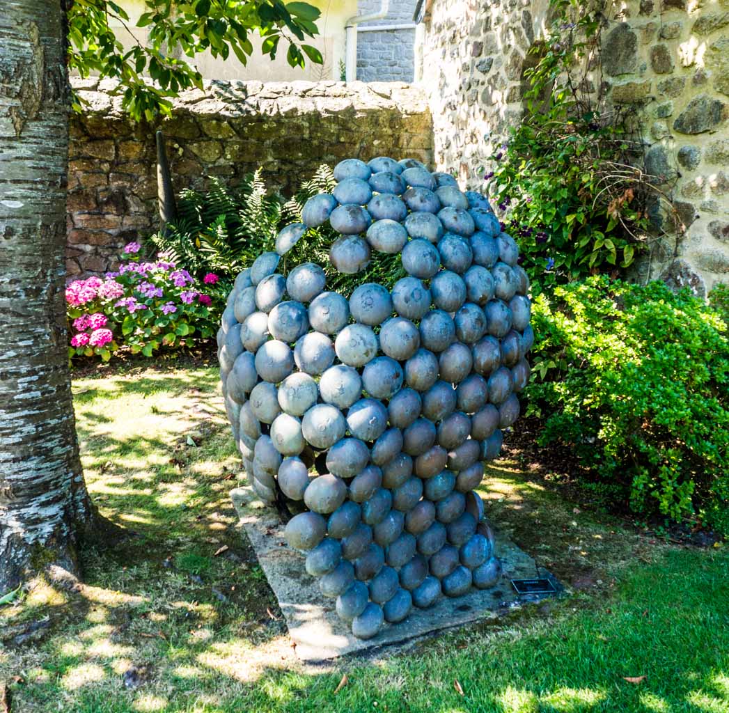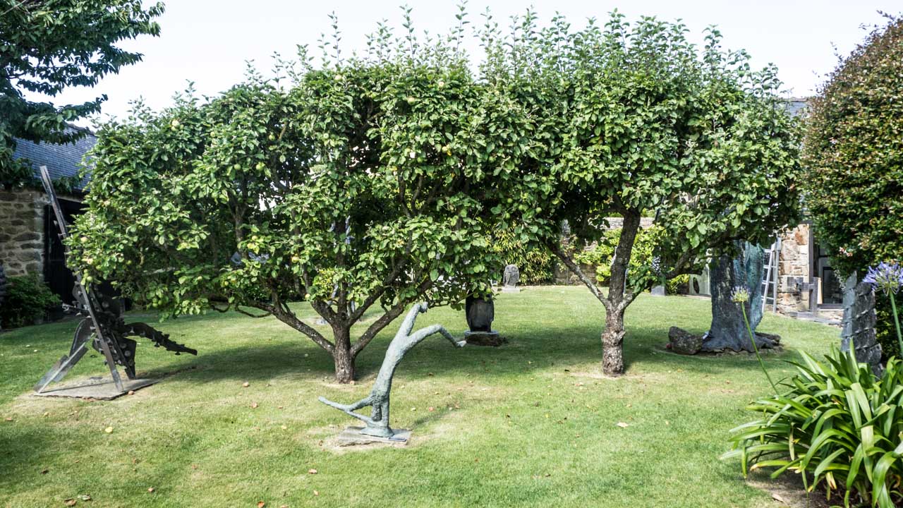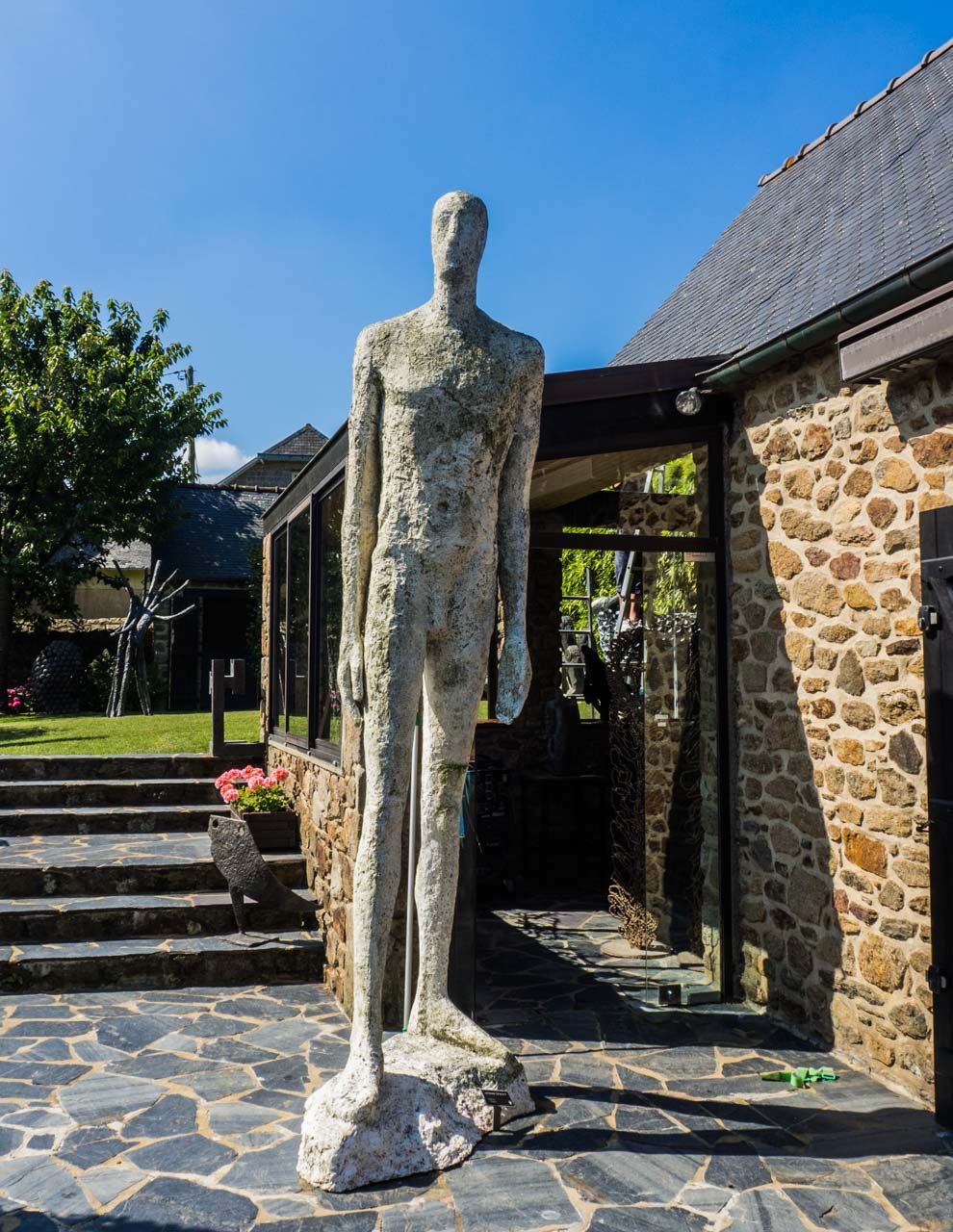 C’est une visite très agréable, j’ai beaucoup aimé le jardin, impeccablement entretenu, et ses sculptures, . Les sculptures se mêlent aux fleurs, font écho aux arbres fruitiers, il faut parfois y regarder à deux fois pour les distinguer.On s’attend presque à voir Pierre Manoli surgir de son atelier…J’ai été impressionnée par la variété des techniques, des matériaux et des thématiques choisis par ce sculpteur cherchant toujours à innover.