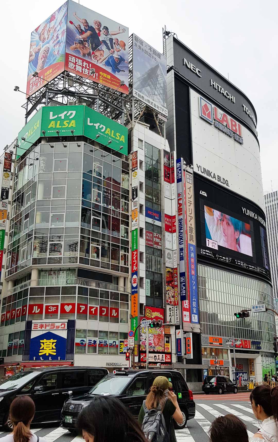 Shinjuku est un quartier très vivant, desservi par la station de métro la plus fréquentée au monde ! Effectivement, la gare est gigantesque et nous nous y sommes un peu perdus au début. Quand on en sort, on se retrouve face à des buildings bardés d’écrans, avec des passages pour piétons dans tous les sens. Restaurants, grands magasins, hôtels et bars s’y succèdent.