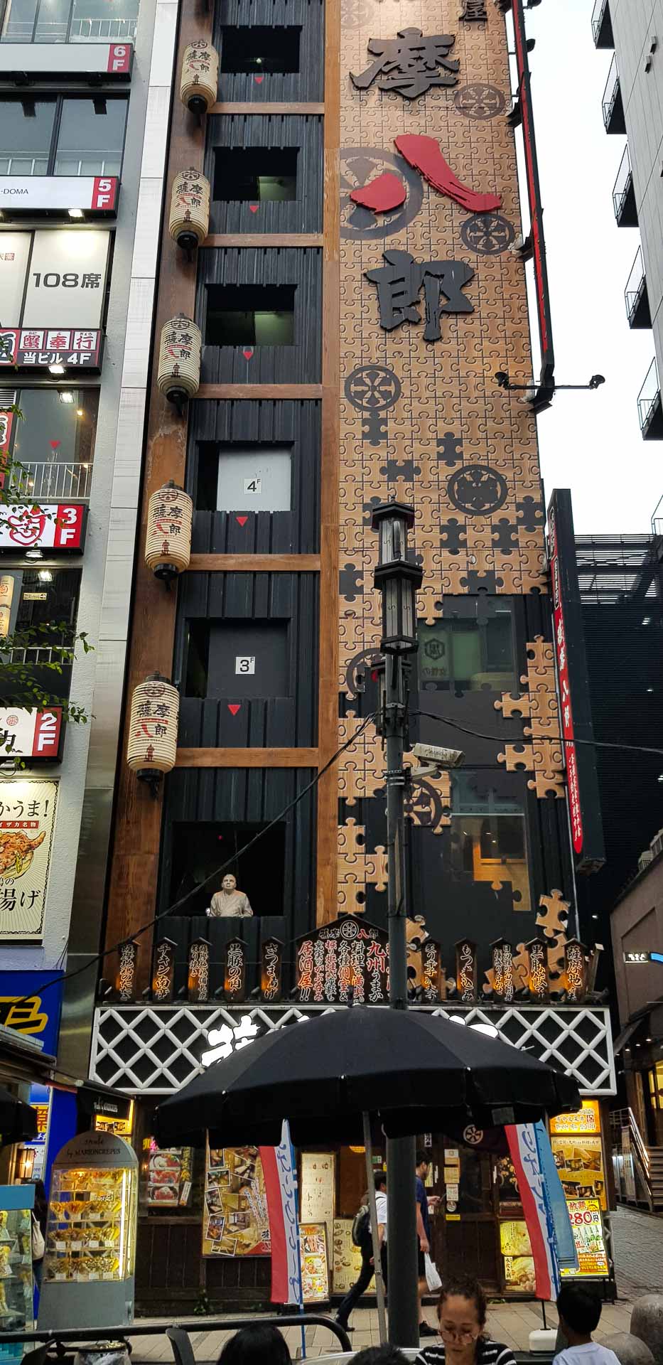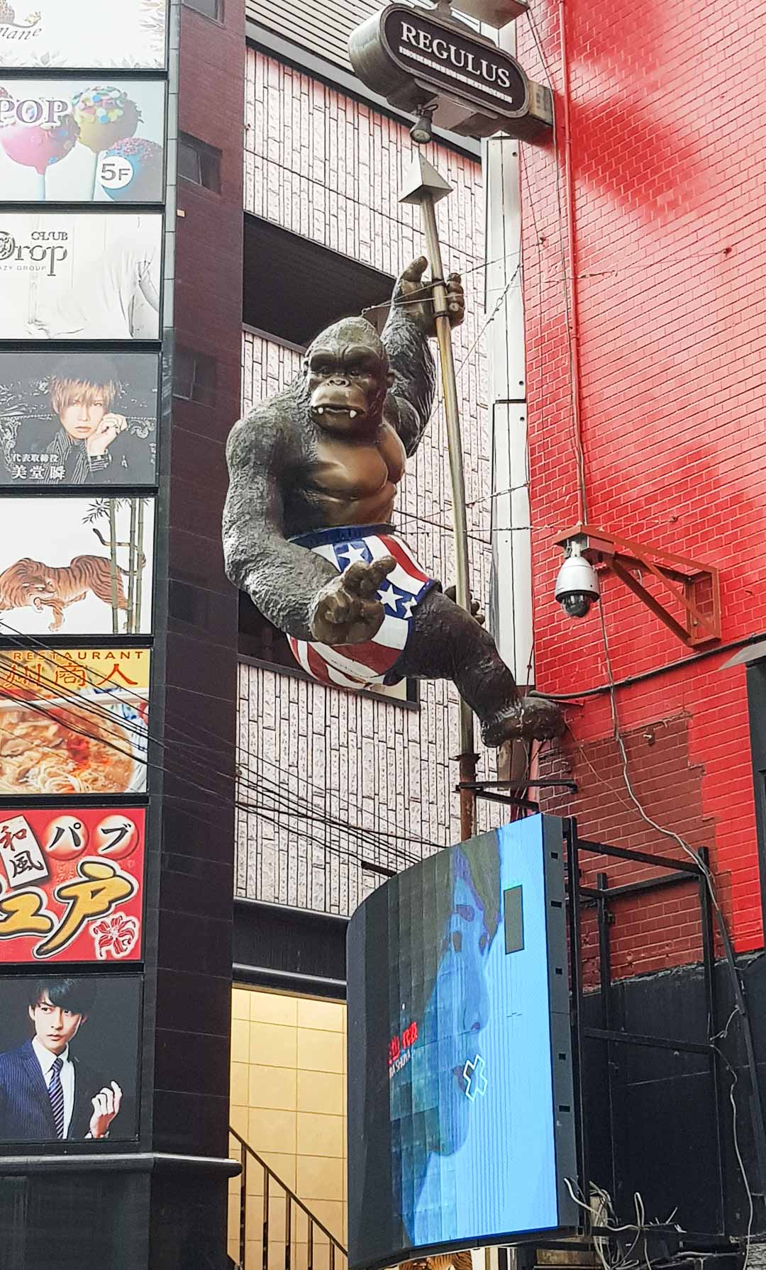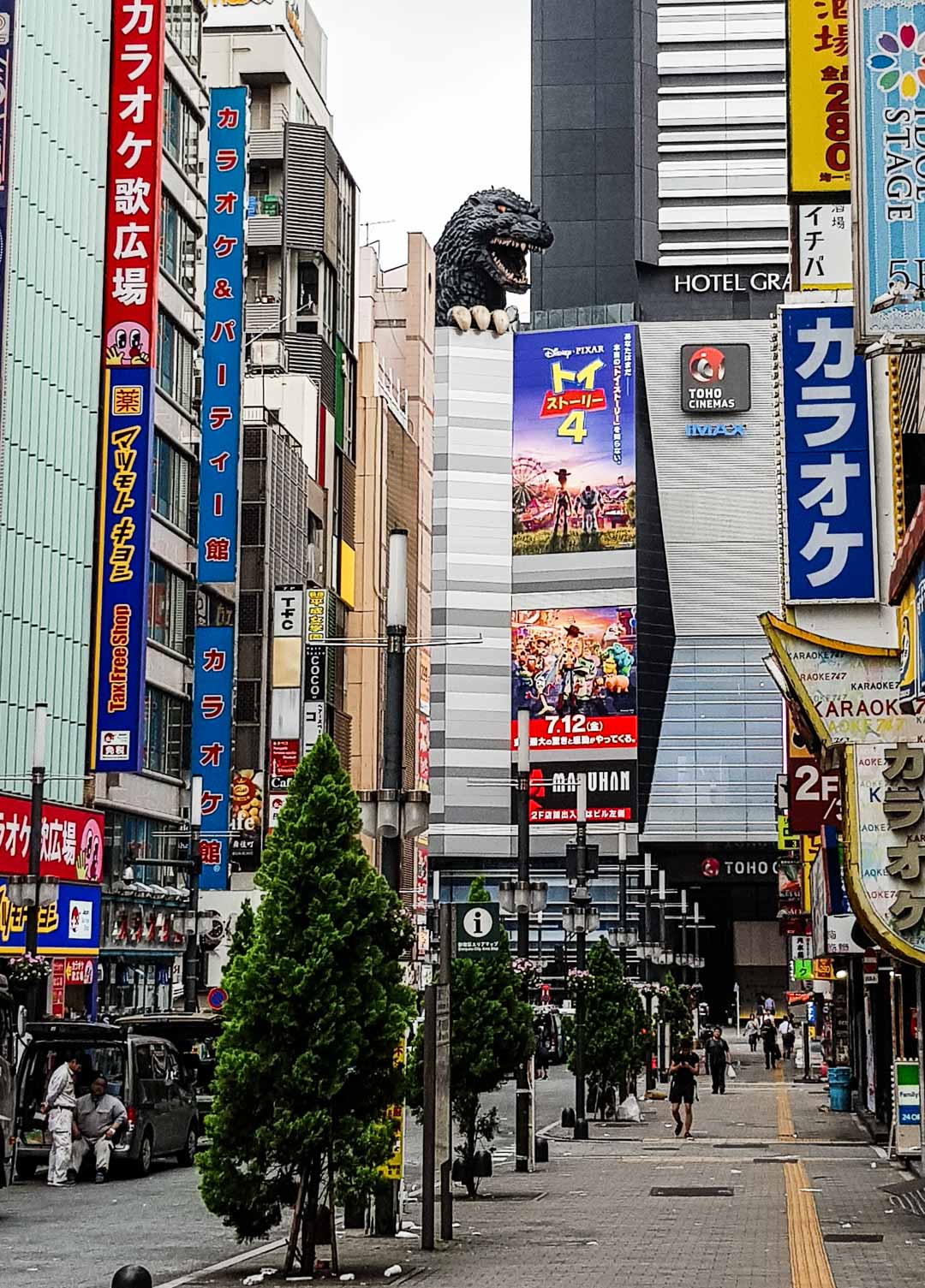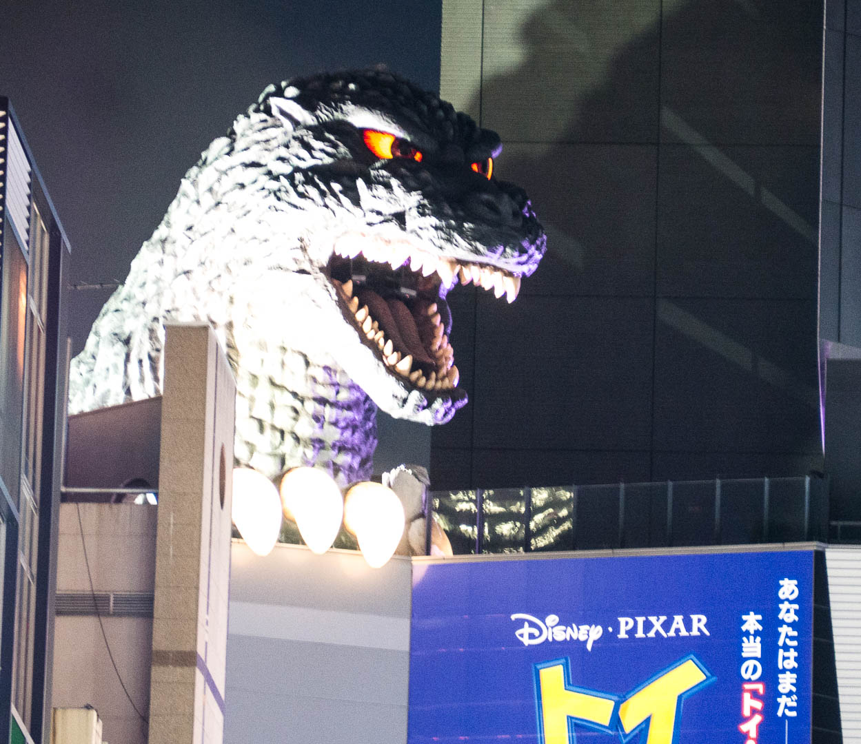 ou un Godzilla qui semble prêt à détruire la ville. Cette tête de Godzilla est animée et s’illumine la nuit…L’immeuble juste en-dessous abrite un hôtel et un cinéma.