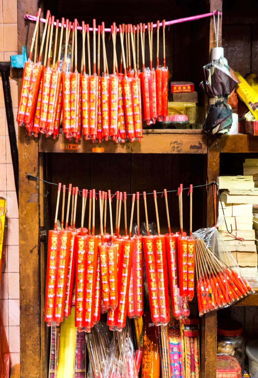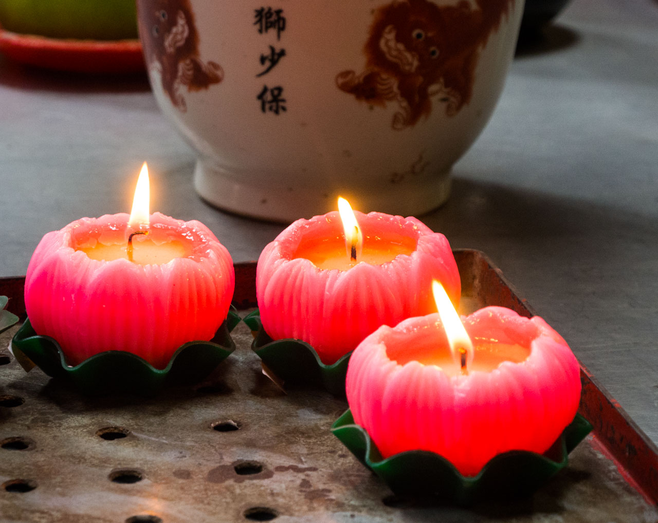 Comme dans beaucoup de temples, le contraste est saisissant entre le calme qui règne à l’intérieur et l’animation de la ville. On chuchote, l’odeur de l’encens chatouille les narines, les carillons tintent dans la brise. Ce temple est plutôt sobre pour un temple taoïste, il n’est pas très connu et je n’y ai pas vu de touristes. je m’y suis sentie bien avec l’impression de faire un voyage dans le temps. J’adore ces bougies roses en forme de fleurs de lotus !