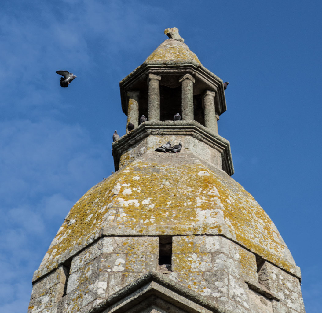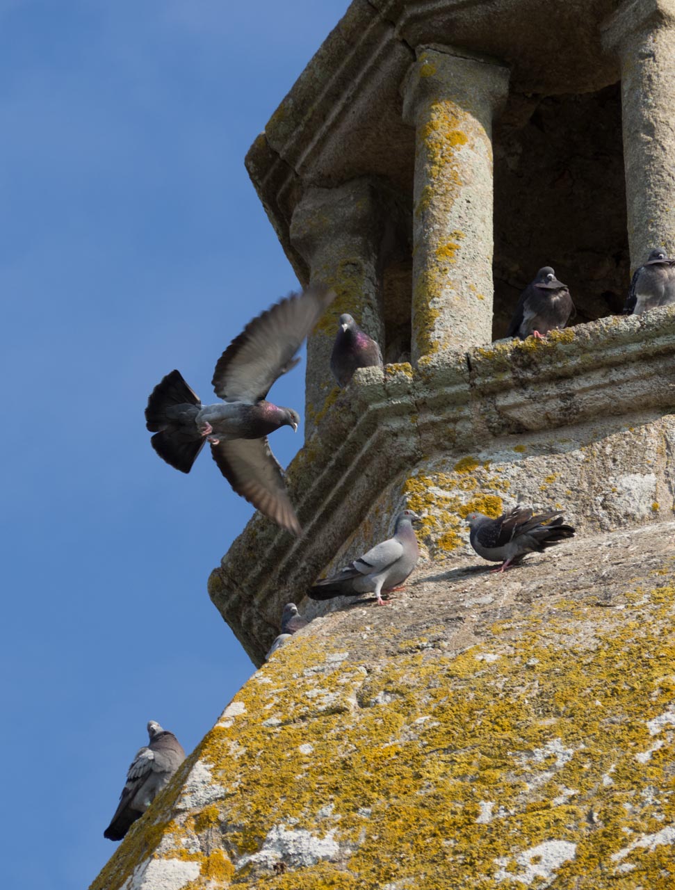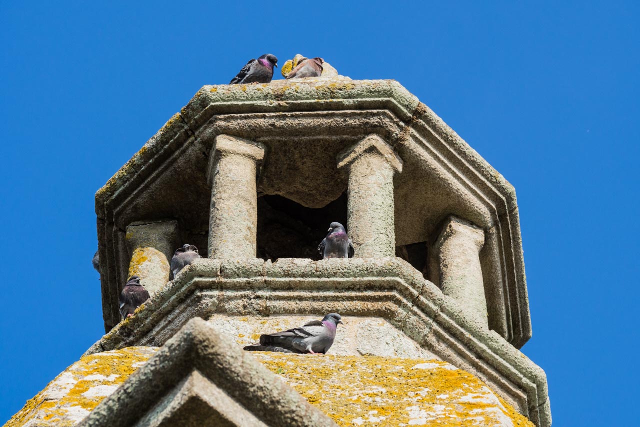 Aujourd’hui, le vieux clocher abrite… des pigeons, qui ont l’air de se demander pourquoi j’ai pris autant de photos de leur maison ! Ils m’ont observée avec curiosité…