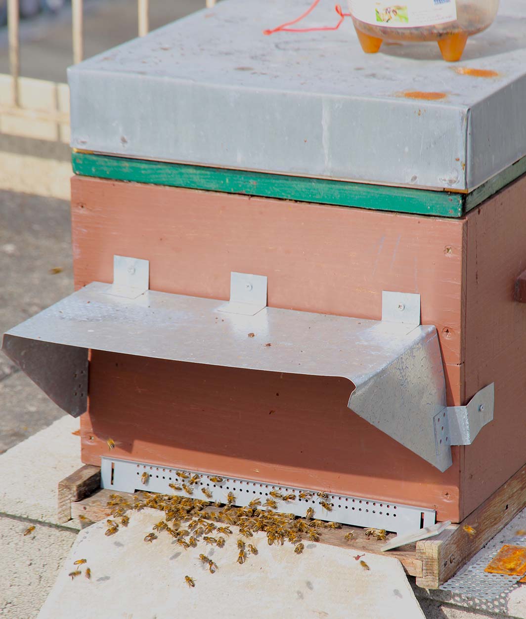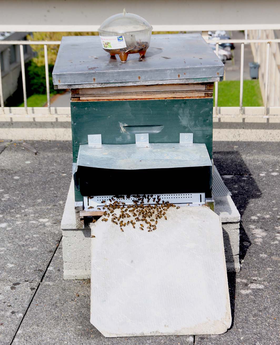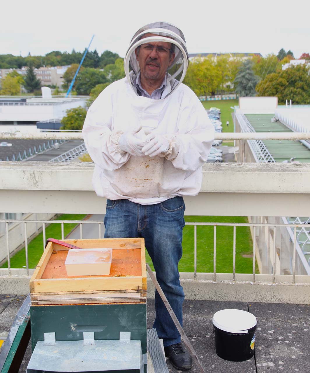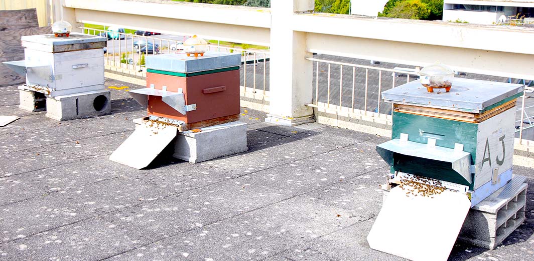L’idée d’installer des ruches dans notre école d’ingénieurs ne date pas d’hier mais il fallait trouver un endroit adapté. Le toit végétalisé de la bibliothèque paraissait idéal mais il est facilement accessible et nos étudiants ont parfois des idées saugrenues (surtout quand ils ont un peu fait la fête) donc finalement, les ruches ont été installées au dernier étage du bâtiment d’enseignement, sur une terrasse inaccessible sans l’autorisation d’Abel (c’est lui qui a les clés !). Du coup, les abeilles sont bien tranquilles et ne présentent pas de danger pour les étudiants et le personnel.