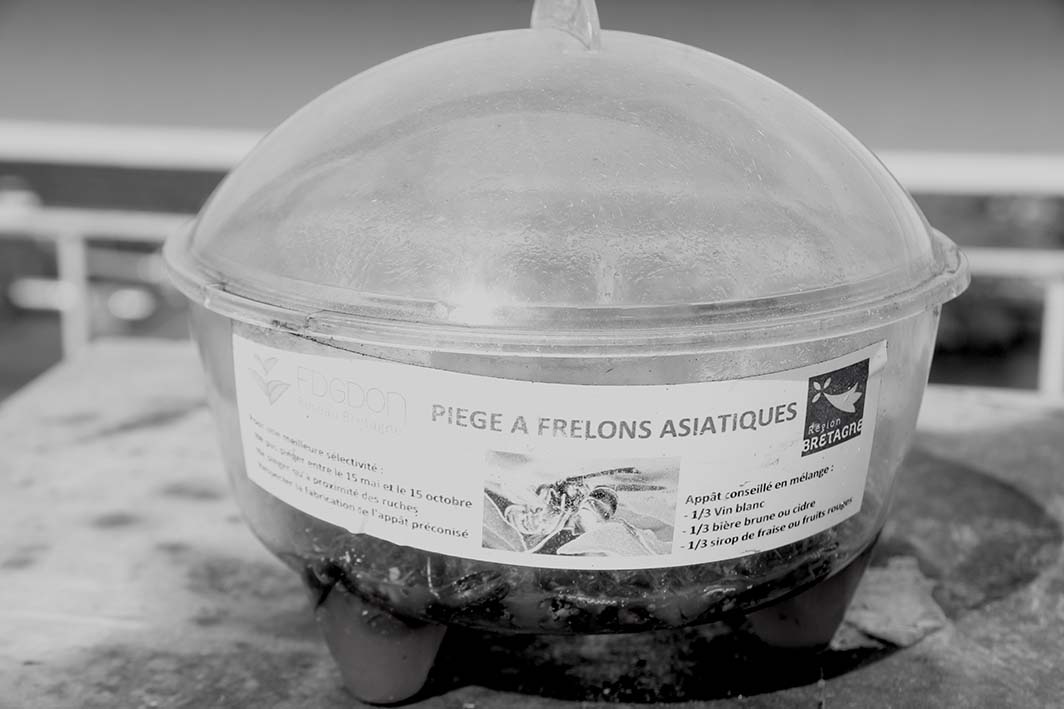 J’ai posé la question et Abel me répond que le mélange utilisé n’attire pas les abeilles : 1/3 de vin blanc, 1/3 de bière brune et 1/3 de sirop de fruits rouges (de vrais ivrognes, ces frelons asiatiques !) 😉 Les abeilles sont donc protégées.