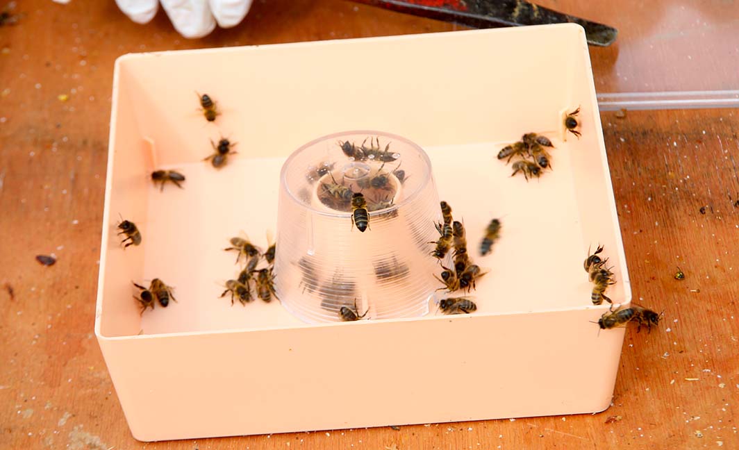 Cet apiculteur sait ce qu’il doit faire pour le bien-être de ses abeilles. Il a mis un piège à frelons asiatiques sur chacune de ses ruches.