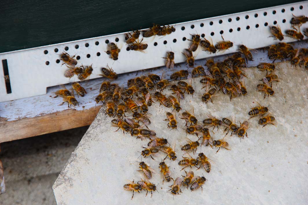 Abel va régulièrement voir ses abeilles pour s’assurer qu’elles vont bien mais aussi pour les nourrir (photo ci-dessus), et surveiller les frelons asiatiques qui font des ravages en ce moment. Je les ai vus à l’oeuvre, ils attaquent les pauvres abeilles sans pitié !