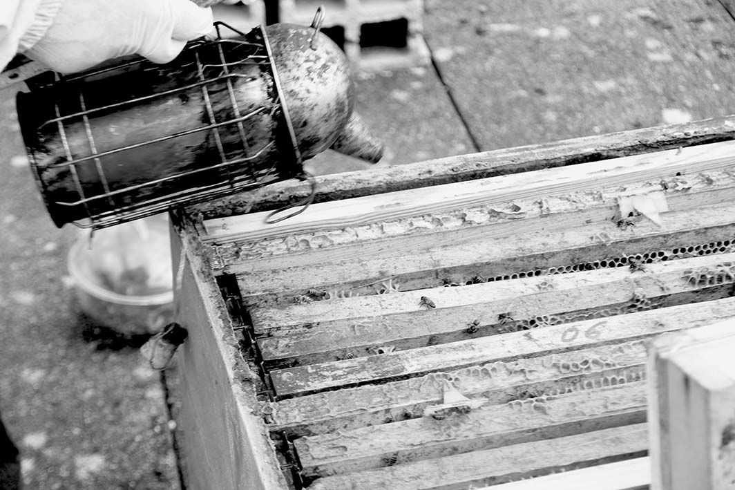 Lors de la liste, j’ai enfilé une combinaison protectrice (non, vous n’aurez pas de photo !) et j’ai pu approcher les abeilles. La fumée d’aiguilles de pin dégagée par l’enfumoir les obligeant à se cacher, il est plus facile d’ouvrir la ruche.