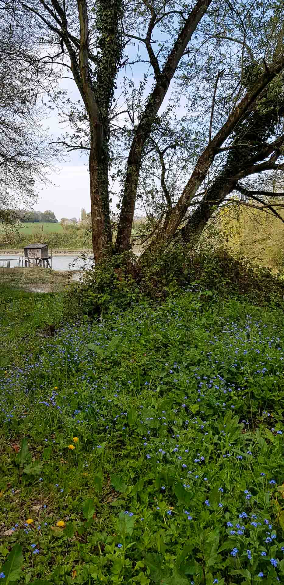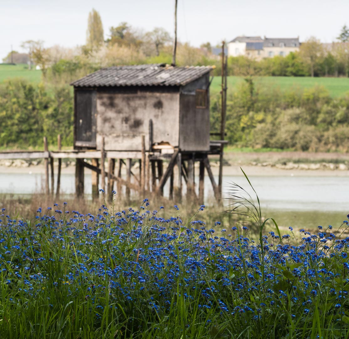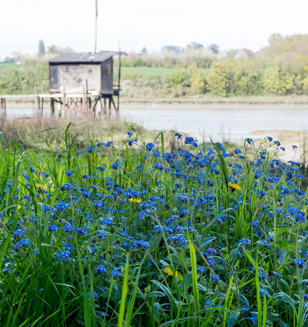 Nous sommes toujours en bord de Rance maritime, avec un chemin en sous-bois qui tout à coup laisse place à un tapis de myosotis avec au loin les cabanes. Certaines sont un peu mieux entretenues car elles font régulièrement l’objet de sorties pédagogiques pour les enfants du coin.