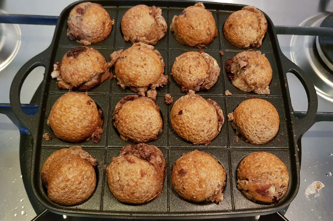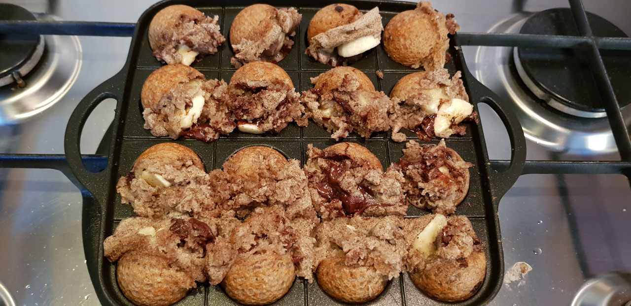 Faire chauffer la poêle à takoyaki sur le gaz. Graisser au pinceau avec de l’huile de coco. Quand la poêle est bien chaude, verser la pâte en remplissant tous les trous et en recouvrant toute la surface de la poêle.
